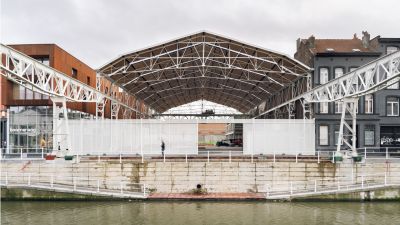 <p> L’acier est pris comme une valeur patrimoniale et identitaire du projet. Les structures légères et fragiles de la toiture, contrastent avec la force des supports au pont roulant, jusqu’aux deux grues faisant signal sur le canal. Après un décapage complet de la peinture au plomb, les parties rouillées ou fragilisées de la structure existante ont été réparées, pièces par pièces. En réponse à ce patrimoine restauré, une nouvelle toiture en tôles pliées et soudées, crée un espace d’accueil à l’opposé du canal, dans la rue Heyvaert, et se déploie comme abris de parking à vélos ou espace de piquenique, en soulignant un autre signal patrimonial, la haute cheminée entièrement restaurée. </p>
