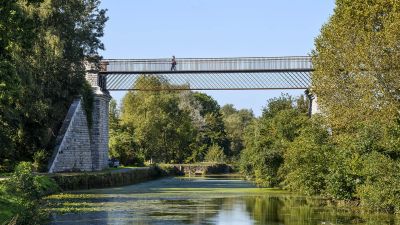 Tekst: <p>La passerelle d’Arquennes enjambe la Samme et permet de connecter deux tronçons du RAVel 141. (Réseau Autonome de Voies Lentes)</p>