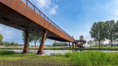 Tekst: <p>La passerelle pour vélos en acier auto-patinable près du Cirkelbos à Almere (NL), située à la limite du polder et de la forêt, est une sculpture atypique. </p>