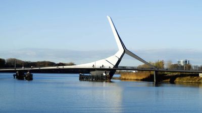 Tekst: <p>Le pont Prince Claus est un pont mobile pour vélos et piétons de 141 m de long qui enjambe la rivière Wantij et relie le centre historique de Dordrecht (NL) au nouveau quartier résidentiel 'Stadswerven'.</p>