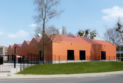 Tekst: Les deux formations, ferronnerie d’art et maréchalerie, ont été réunies, avec cette nouvelle construction, à un seul emplacement pour offrir tout le confort contemporain aux élèves. La nouvelle école comporte un programme d’environ 1525 m2 et part d’un modèle de patio pour garantir la sécurité et la maîtrise du bruit. L’enveloppe de la construction en acier est constituée d’une tôle d’acier prélaquée de couleur cuivre. Cette couleur cuivre assure une présence du bâtiment dans le quartier sans qu’il soit perçu comme trop industriel.