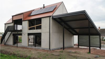 Tekst: <p>Achter een uitnodigende carportconstructie staat een vrij introverte staalskeletwoning, met twee duidelijk verschillende gezichten vanuit de bocht van de straat. De industriële bouwmethode wordt gecombineerd met eerder traditionele elementen en afwerkingen. </p>