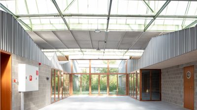 <p>Staal speelt een centrale rol: de nieuwe constructies zijn gebaseerd op een lichte metalen structuur, die flexibiliteit in de indeling en de mogelijkheid tot toekomstige ontmanteling biedt. De gevels van betonblokken en de daken van geprofileerd plaatstaal, in natuurlijke aluminiumtinten, passen bij het industriële karakter van de locatie. De oorspronkelijke materialen worden hergebruikt, de sloopwerken teruggewonnen en het puin gerecycled. Gegalvaniseerd staal is ook gebruikt voor de leuningen en poorten, wat zorgt voor transparantie en veiligheid. Een roestvaststalen luifel aan de straatgevel markeert de nieuwe faciliteit. Een beplante patio en een 'binnenstraat' verbinden de ruimtes, zorgen voor licht en openen zich naar het park. </p>