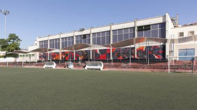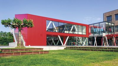 Tekst: Emmaüs primary school in Aalter has been given a facelift by the addition of a colourful new building that houses a gymnasium and dining room. Above ground is a structure in S 235 JR steel with a fire-resistant coating, which rests on the concrete substructure of the gymnasium. The visible columns are placed at an angle, their rounded sections lending them a touch of elegance. The colourful facade covers approximately 230 m² and is finished in ‘JI Grégale’, a facade cladding system with connected steel slats in three different colours. These have been evenly spaced on the basis of a facade study, and are mounted on an adjustable control structure. The side walls are clad with sandwich panels coated in three different colours and the sloping roof is also finished with sandwich panels. Thanks to its roadside location, the bright red sandwich panels and the colourful slats, you are unlikely to miss this eye-catching building.