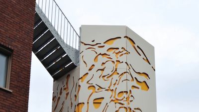 Tekst: This sculpture features the characteristic ‘blob’ that the artist often uses on a smaller scale. The entire oeuvre is permeated with contrasts between conventional architectural models (boxes) and virtual designs (blobs) but here the artist chooses a third way, opting for a synthesis of both. This results in forms that are removed from their virtual space and transformed back into a graphic abstraction, giving rise to a dynamic drawing that harks back to traditional graphic techniques whilst also referencing contemporary graffiti and digital design. The ultimate aim was to make the facade area more attractive and transform it into a landmark. The design was mounted on the facade of the tower where mounting points were provided at strategic places. The sheets of weather-resistant Corten steel, most of which had been supplied pre-assembled, were then screwed into place.