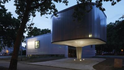 Tekst: The TrinkHall Museum, which was created by the renovation and extension of an existing modernist pavilion dating from 1963, stands in the Parc d’Avroy in Liège. The area of the museum has now been doubled to 1,800 m2 and both the existing space and the functional extensions placed under a protective dome. Economical use of materials, compactness and energy efficiency were important considerations and gave rise to the realisation of an extremely lightweight skin in 50 mm multi-walled polycarbonate sheets. Thanks to the use of S235 steel with a span of 21 m, the building envelope has a very lightweight structure. The supporting structure has been coated in fire-resistant paint to guarantee a fire resistance of 60 minutes and the corresponding figure for the roof structure is 30 minutes. Steel was also used to finish the roof and floor edges, all internal parapets, the museum furnishings and the library.