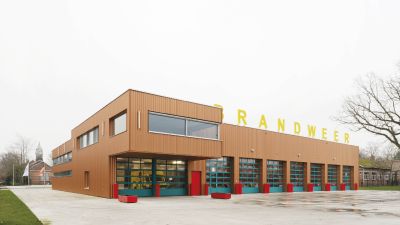 Tekst: The new fire station in Leopoldsburg is beautifully situated in the town centre overlooking an attractive open lawn dotted with trees, including a protected ancient lime and oak . Its solid base structure is clad in curved, copper-coloured steel plates that blend in perfectly with the brick buildings that dominate the surrounding area. Given the nature of the building, it was essential that the design allowed for impeccable organisation and a swift exit every time. Covering the facade with steel was not only an aesthetic choice but also a sustainable and economical one, and the pre-painted steel sinusoidal profiles came with a three-layer polymer coating of primer, colour coat and varnish. Inside the station, a ceiling in white profiled sheet steel has been installed in the fire engine depot. In the entrance hall stands a main staircase made of welded steel stringers that function as a parapet and support the folded steel steps, all painted a striking zinc yellow.