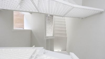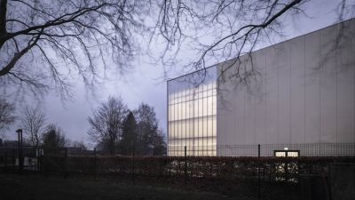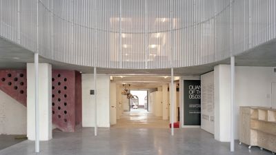 Tekst: To highlight the versatility of the activities that take place in the new Brussels iMAL, they are grouped around a unique void that extends over three floors and goes by the name of the ‘Aviary’. This structure in lacquered steel extends to the second floor and is clad in micro-perforated corrugated aluminium sheets that serve as both a transparent veil and a parapet. The undulation of the aluminium sheets is accommodated in the slender and lightweight supporting structure made up of seven 5,200 mm high frames measuring 3,000 mm by 100 mm (length x width). The hanger bars are matched to the corrugated metal and digitally cut out. The supporting structure was first installed between steel columns anchored in the floor, and the corrugated sheets then installed using a thousand dowels to allow for future replacement if necessary. The total length of the aluminium veil is 21 metres and all elements can be disassembled for reuse in future projects.