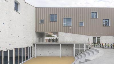Tekst: A new municipal school was to be built in Heestert with preschool and primary sections, various parts of which – for example the sports hall and dining room – were to be used intensively outside school hours. The aim was to accentuate and build upon this interwovenness with the village centre and surrounding housing in the design. Orientation was a key consideration, with careful positioning of the school building creating various outdoor spaces, each with their own identity. The southern section has been kept low to maximise lighting and the building is folded to create a view of, and sense of connection with, both the village centre and the park. The architecture strives to create a recognisable form, and steel is everywhere: in the elements of the supporting structure, the canopy, the liner trays of the sloping roofs and in the profiled steel sheet for the roof and facade cladding.