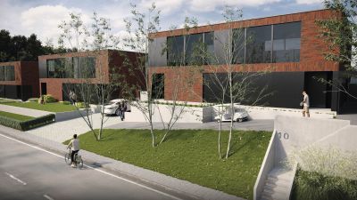 Tekst: The Corelio site on the Gosset business park in Groot-Bijgaarden, just south of the Brussels Ring Road, used to be a road-side storage building. However, it had a great deal more to offer than that and is now being transformed into a multi-layered and multifunctional business park for multiple users. This work, part of a wider ecological transformation, will allow the building to excel as a versatile office space. The building has been completely stripped of its outer shell, repackaged with a well-insulated lightweight outer wall made of steel liner trays and finished with white corrugated steel sheets. Cantilevered steel boxes are suspended from the facade at a few strategically chosen places, but the most striking feature is the open steel structure on the facade. The intriguing pattern of horizontal bands clad with three types of perforated corrugated sheeting lends the building aesthetic refinement and gives rise to a fascinating interplay of light and shade.