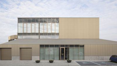 Tekst: The municipality of Machelen needed new offices and workshops for its municipal services to replace the handful of dilapidated buildings scattered around the area. The site was centred around a compact workmen's shed, creating a circulation loop around it that provides efficient access to both the building and the surrounding fleet of cars. The efficient stacking of work sheds, garages, warehouse, canteen, changing rooms and offices gives rise to a strikingly sculptured space. The structure of the building around the stairwell and lift core comprises a steel skeleton with sandwich wall and roof panels, finished with a special sawtooth-profiled facade plate draped over the volume like a curtain of light. To provide the required second escape route for the upper floors, a large and eye-catching steel spiral staircase was installed next to the building. This also provides direct access to the refectory from outside.
