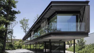 Tekst: A new development has been built on an unassuming, almost triangular, wooded plot in an SME zone overlooking the Albert Canal incorporating a welding workshop, a landscape design office for about four people and a dwelling with loft-like feel. To highlight the activities of the welding company, a decision was made to work with exposed sectional steel and steel awnings. Although the structure of the building is actually a hybrid of concrete and steel, it gives the impression of being a pure steel construction, since the black UPN400 steel girders and columns are visible within the wooden-slatted facades. The building incorporates a total of 38 tonnes of S235 sectional steel – a choice that was driven primarily by aesthetic considerations, although the hybrid steel-concrete construction also allowed the floor and roof slabs to be kept slender.