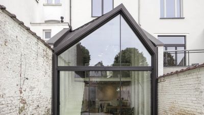 Tekst: This private house in the centre of Brussels has been completely transformed by the addition of a steel extension at the rear. This 6 m high extension standing 4.5 m long and 4 m wide and weighing around 4,500 kg, was designed as a whole and includes an integral staircase. As the new building section had been prefabricated in the workshop (a process that took three weeks plus a further one week for painting) it was installed in just three hours. The pared-down construction of 5 mm sheet steel reinforced with a set of five 20 mm thick by 100 mm wide portals made it possible to optimise the additional space, and the painted steel serves not only as a visual signature of the project, but also as an inner shell. The waterproof steel cocoon also acts as a natural vapour barrier beneath the external wall insulation around it. The steel is also fully recyclable.