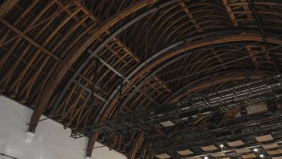 Tekst: Placing a renovated, contemporary concert hall within the historic context of a thirteenth-century monument – in fact one of the first brickwork constructions to be built in Belgium – proved to be quite a feat of engineering. An inspection of the existing roof construction of Music Centre De Bijloke in Ghent indicated that it could not support the additional load of the new fly system. The challenge was therefore to design an additional supporting structure that would be concealed from view in amongst the existing roof structure. Two steel bowstring trusses measuring around 16 m in length and 5 m in height were placed between the historic wooden arches, and connected by means of box sections to which the fly system was attached. All the curves are aligned and centred on the axis of the new hall. Importantly, the subtle steel construction can be removed at a later date if required, without damaging the protected monument.