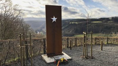 Tekst: This monument, built to commemorate the 75th anniversary of the Ardennes Offensive in the Second World War, weighs 1.3 tonnes and stands 3 metres high and 1 metre wide. It takes the form of a memorial plate made of 50 mm Corten steel, pierced by a star-shaped perforation symbolizing the impact of a shell; this is a nod to America’s role in events. The monument is held in place by sixteen anchors cast into the concrete base. To create this memorial plaque, the 50 mm thick steel plate was treated using a burner and the hot-formed star then punched out with a 50 tonne hydraulic jack. Since the steel is a reference to the inhuman coldness of war and the use of armoured tanks, this was an operation bursting with symbolism: the impact of the shell stands for the omnipresence of violence during the struggle. The patinated surface in turn represents the ravages of time, which, to some extent, heals all wounds. Corten steel was also chosen for its durability, low maintenance and specific texture.