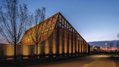 Tekst: This lighting company, which specialises in illuminating public and commercial spaces, has had its new headquarters built on the edge of a residential area. Steel predominates, and the 154-tonne steel skeleton is a reference to the saddleback roofs typical of the surrounding area. Two gantries made of hot-rolled S235 steel with a span of 12.5 metres generate various roof areas over a length of more than 100 metres, giving rise to a 22,000 m³ anthracite-coloured space for the storage and maintenance of lighting modules. An upper space made of a lightweight structure in square cross-section steel tubes protects the offices next to the industrial hall from overheating. The facades are clad in steel with three different finishes: the corrugated sheets on the roof are folded down over the facades, where they meet Corten and reflective stainless steel.