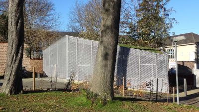 Tekst: To blend in with the aesthetics of the existing architecture, a dynamic steel structure finished in expanded metal (ALU) was chosen for the bicycle pavilion on the site of the Halle Public Centre for Social Welfare. This is similar to that already in use in the Social House for the external emergency staircase and the cladding of a ventilation shaft. The steel structure was built on a concrete substructure that also carries the retaining walls for the existing slopes; the height difference and the existing slope were used to divide the building into two levels. A coarse mesh of cable in X-TEND DIN 1.4401 / AISI 316 stainless steel forms a barrier between the change in level between the lower and upper storage area, whilst ensuring that each cycle stand remains open to and visible from the other. Both areas will be equipped with lighting, security cameras, and charging facilities for electric bicycles.