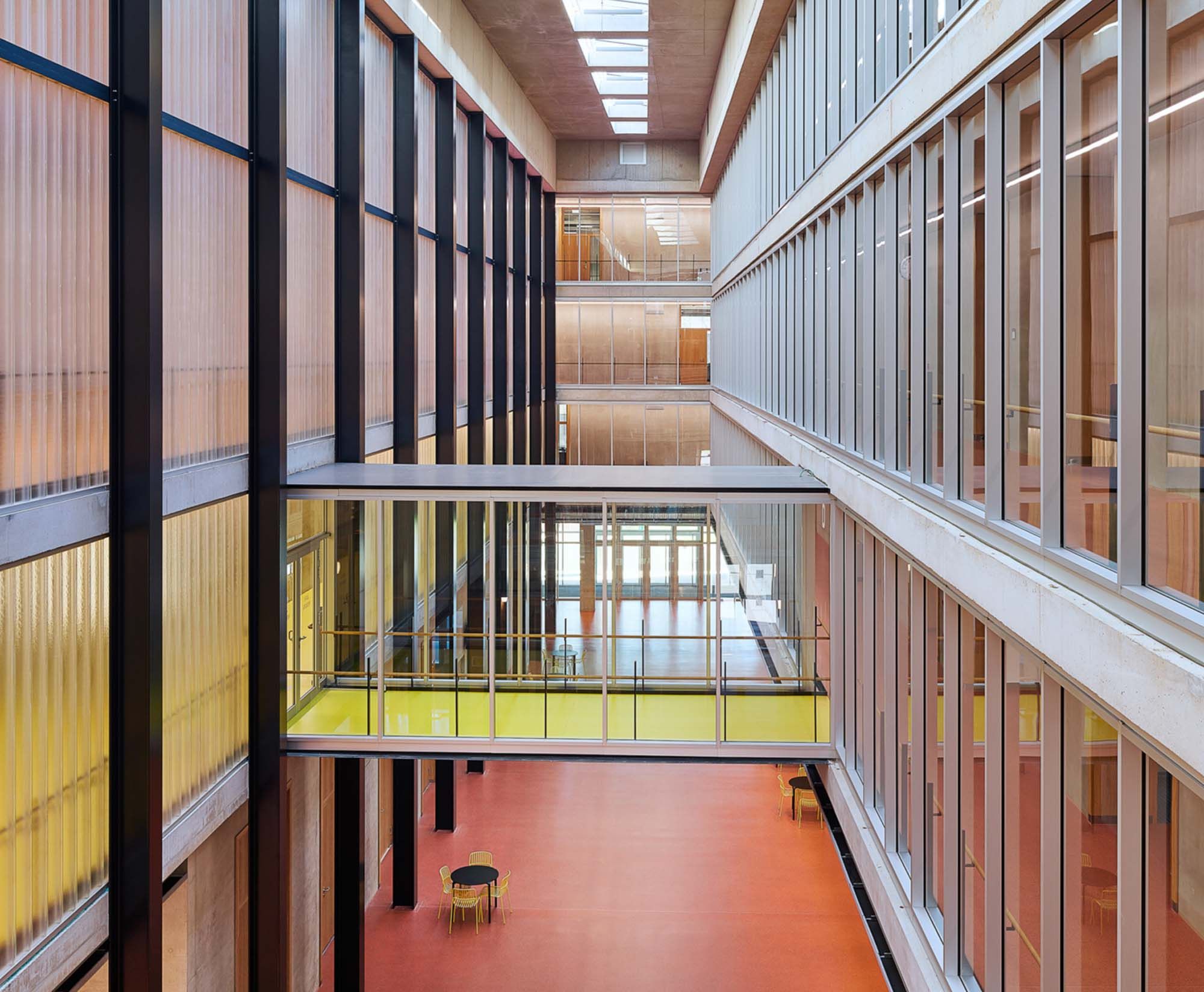 Environ 1 800 tonnes d’acier (S355 J2) ont été utilisées pour la structure et la façade. Pour la façade haubanée, pas moins de 7800 m de câbles ont été nécessaires.