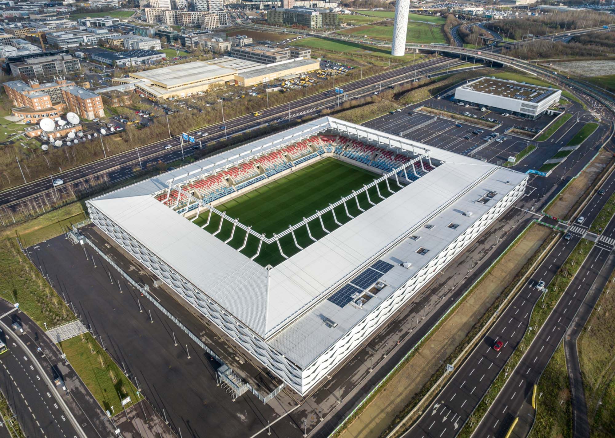 L’une des caractéristiques les plus impressionnantes de ce stade est sa façade haubanée, qui définit son identité visuelle. Cette façade légère en acier est composée de câbles d’acier tendus diagonalement, sur lesquels reposent des panneaux métalliques en aluminium en forme de losange. Cette conception complexe, à la fois esthétique et fonctionnelle, enveloppe le stade sur ses quatre côtés, s’élevant majestueusement à une hauteur de 9 m. L’utilisation de l’acier dans cette structure a été un choix stratégique, offrant à la fois légèreté et robustesse, et permettant la création de formes architecturales élégantes.