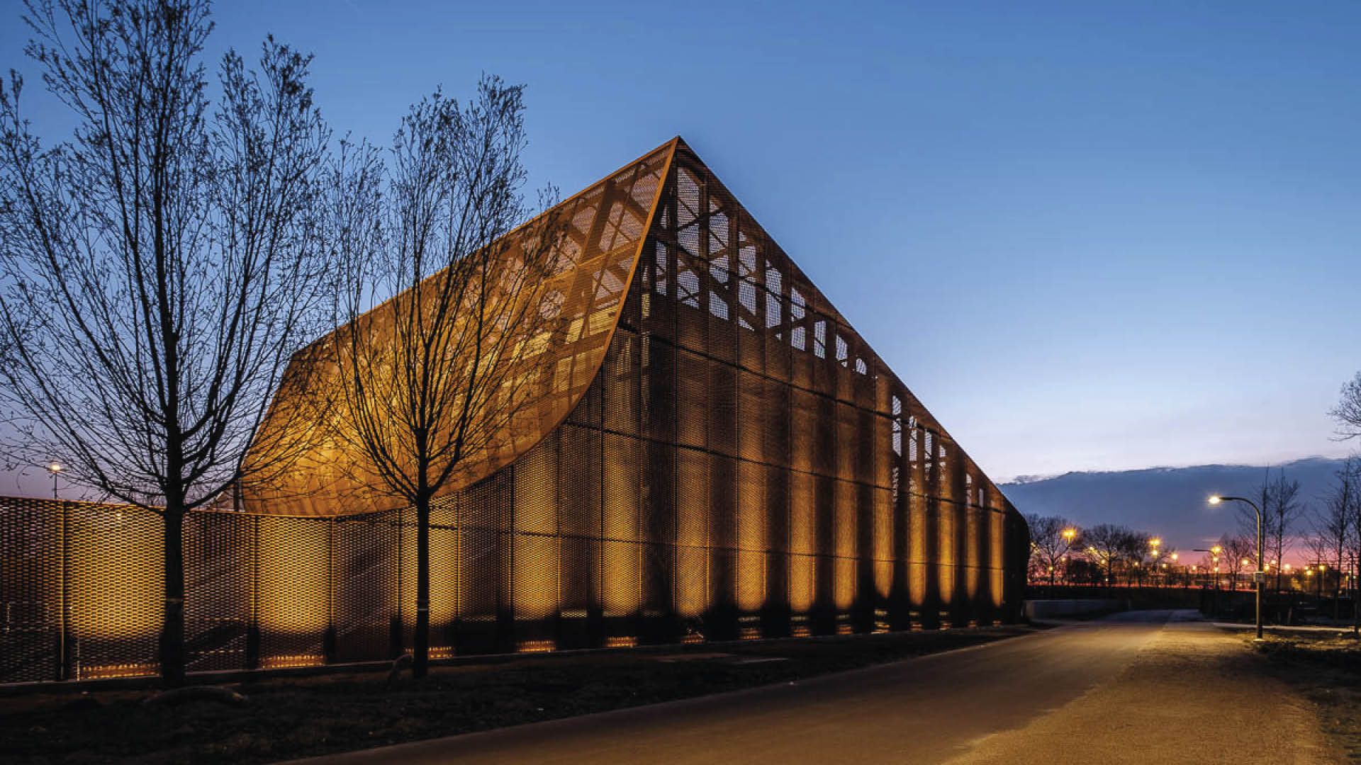 Comme la station de pompage Grote Schijn est visuellement très présente à proximité du ring d’Anvers et de la piste cyclable contournant la ville, il a été décidé de la recouvrir de métal déployé en acier auto-patinable (‘corten’). Pour en augmenter encore l’effet, sa clôture et ses deux grilles d’accès ont également été conçues en ce même acier ‘corten’. Le bâtiment principal a d’abord été doté d’une structure porteuse de ± 35 tonnes. Ce squelette est constitué de poutrelles en acier qui ont préalablement été galvanisées à chaud avant d’être revêtues de couleur rouille par thermolaquage. Ensuite, les parois latérales et le toit ont été recouverts de cassettes en acier auto-patinable. Du côté des vérins de la station de pompage et sur sa partie arrière, tant les poutrelles de la structure de support que les cassettes ont été courbées afin de renforcer l’effet architectural. Huit panneaux de portes en métal déployé ont également été posés, afin de dissimuler les portes du bâtiment en béton. En comptant également la clôture et les grilles d’accès, près de 1.400 m² de métal déployé ont été mis en œuvre.