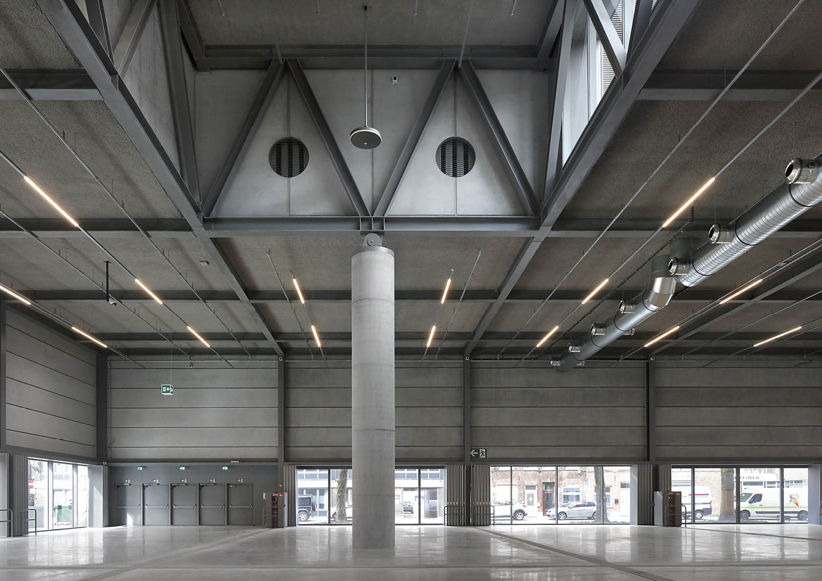 Le hall d'exposition de 4480 m2 repose sur un piédestal en verre, attirant la place extérieure à l'intérieur comme une place couverte. Il s'agit d'un espace élevé dont les dimensions des baies sont de 15/30/15 m et qui repose à l'intérieur sur seulement six colonnes circulaires en béton de 1,20 m d'épaisseur. Six fermes secondaires et deux fermes primaires en acier transfèrent les charges des fermes secondaires aux six colonnes via une imposition architecturale articulée. L'entrée de la salle de conférence est dominée par un impressionnant porte-à-faux de 60x6 m qui assure une transition progressive entre le parvis et l'entrée.