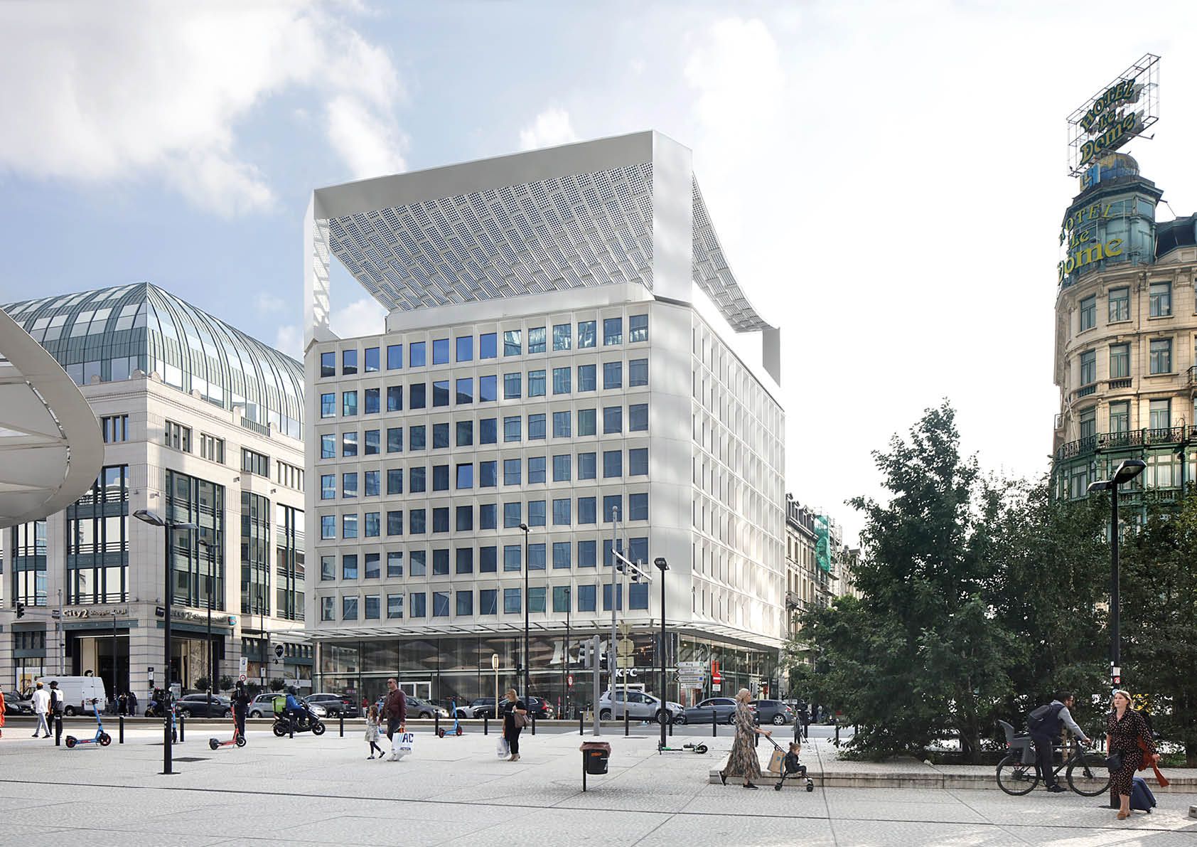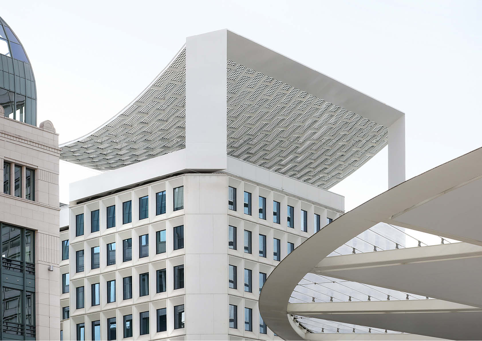 Structure métallique monumentale au sommet d'un immeuble de bureaux rénové