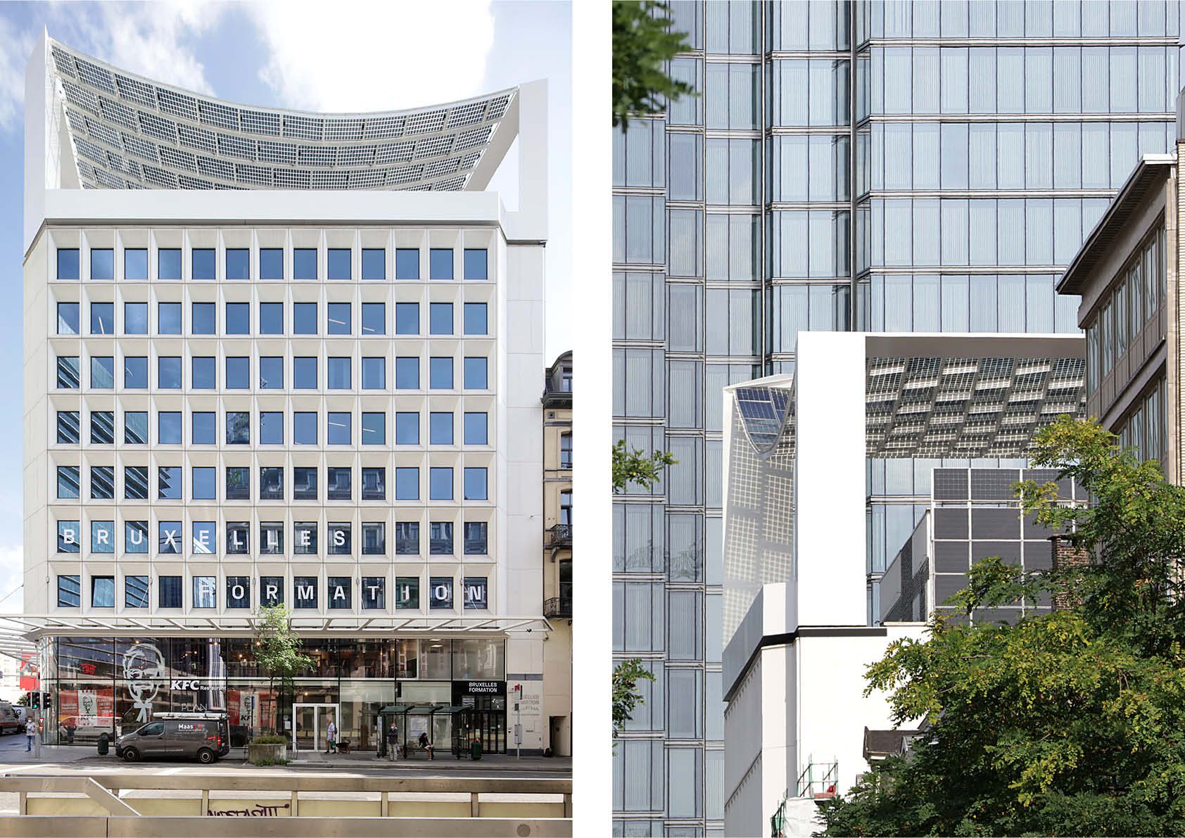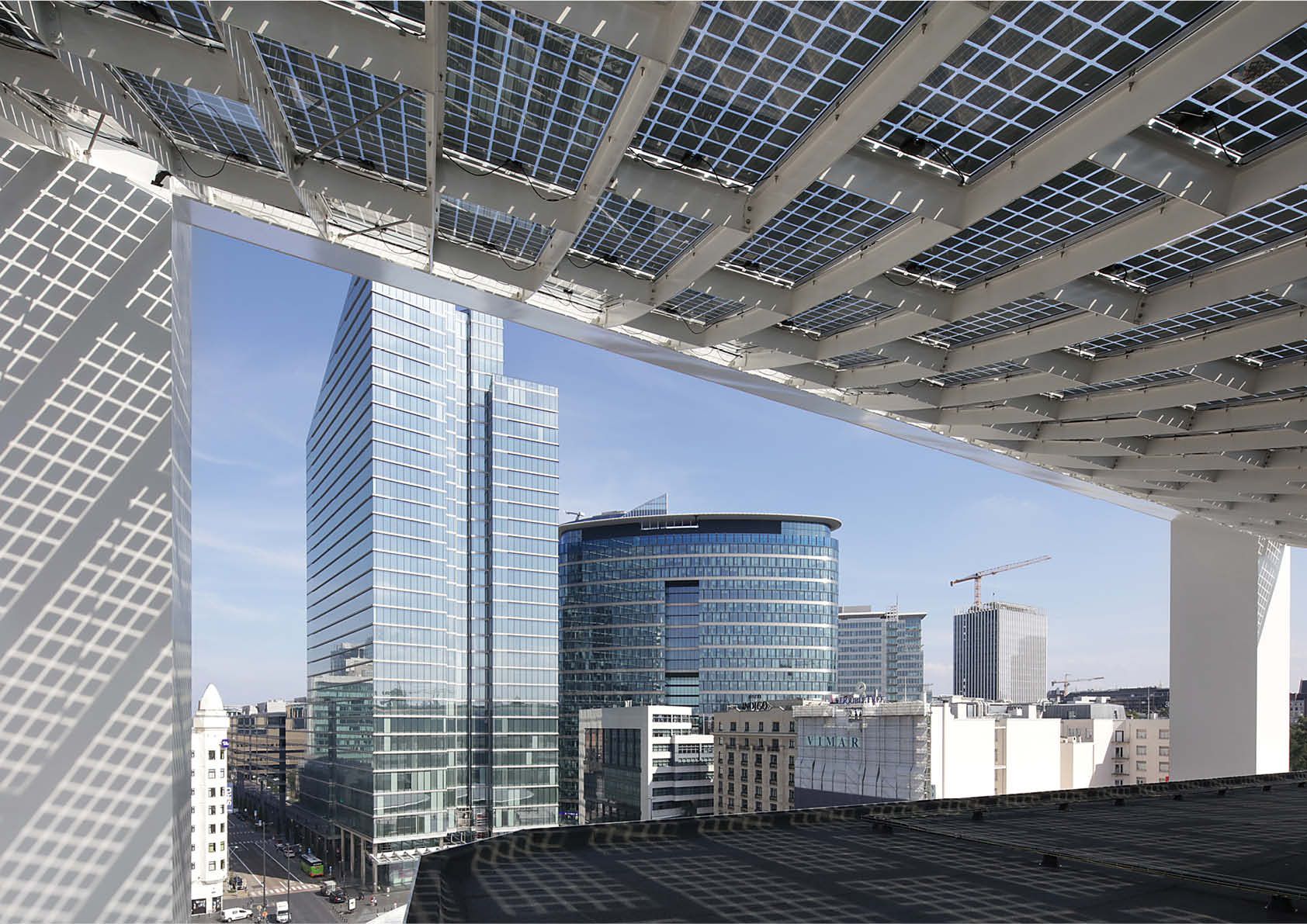 L’auvent Bota Solar génère de l’énergie solaire et filtre les rayons du soleil. On a pu le voir récemment perché au sommet d’un immeuble de bureaux rénové des années 1970, au cœur de Bruxelles.