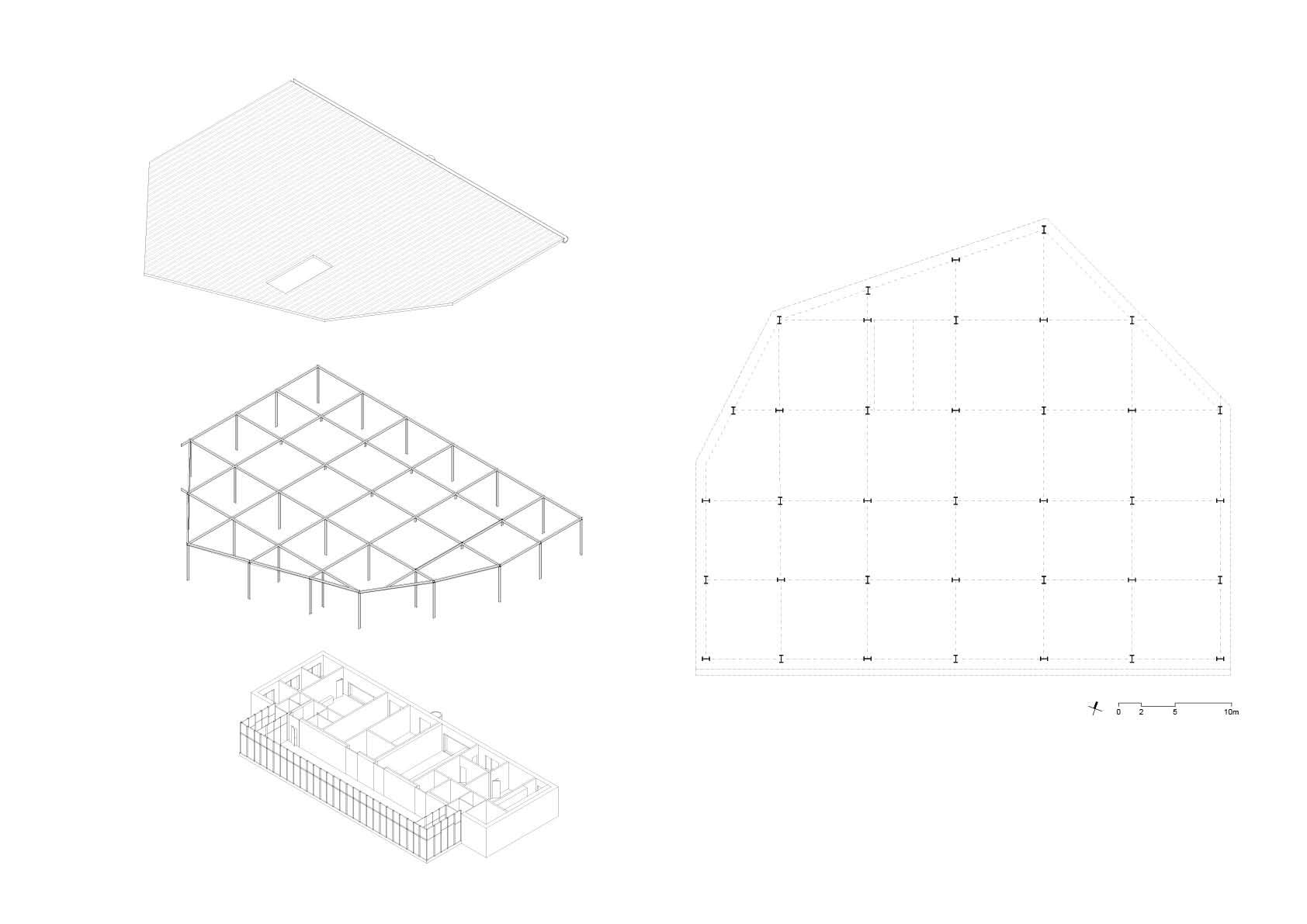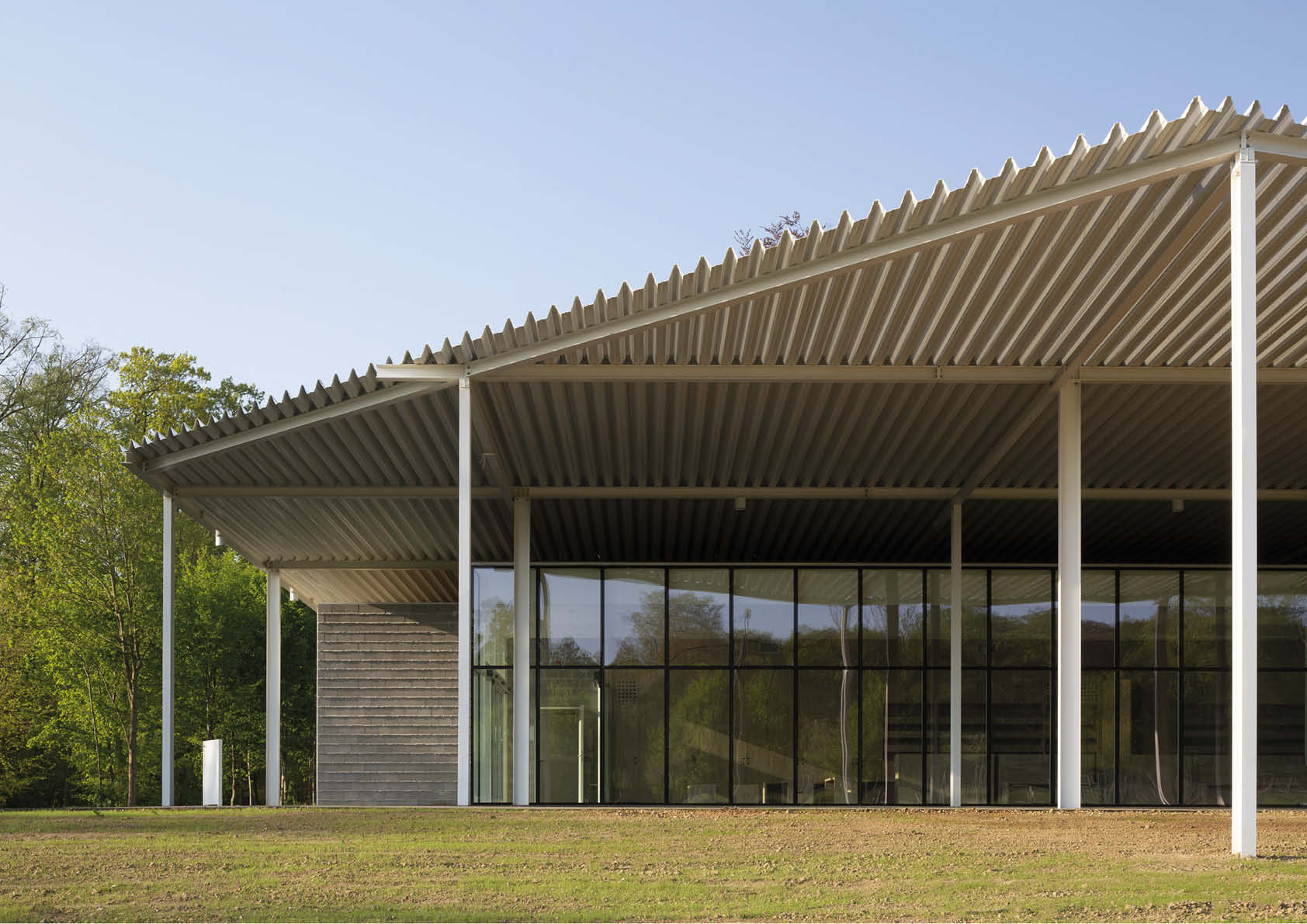 Le bâtiment lui-même est constitué d’un volume en verre abritant la réception proprement dite et une boîte fermée avec les fonctions administratives, le stockage, les archives, la bibliothèque, la salle de réunion et les installations sanitaires. Ce volume est composé d’un mur-rideau porteur de 37 tubes d’acier sur trois côtés avec une hauteur de 4,45 m.