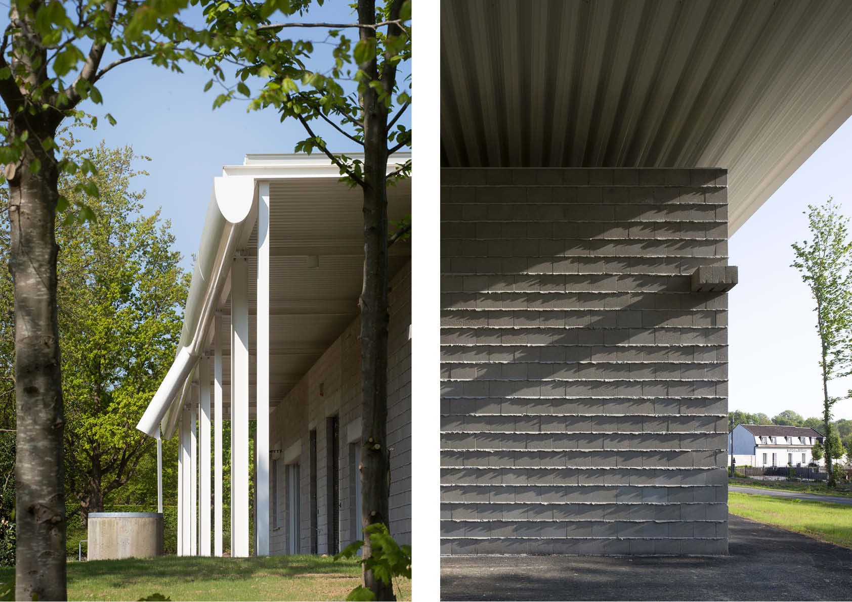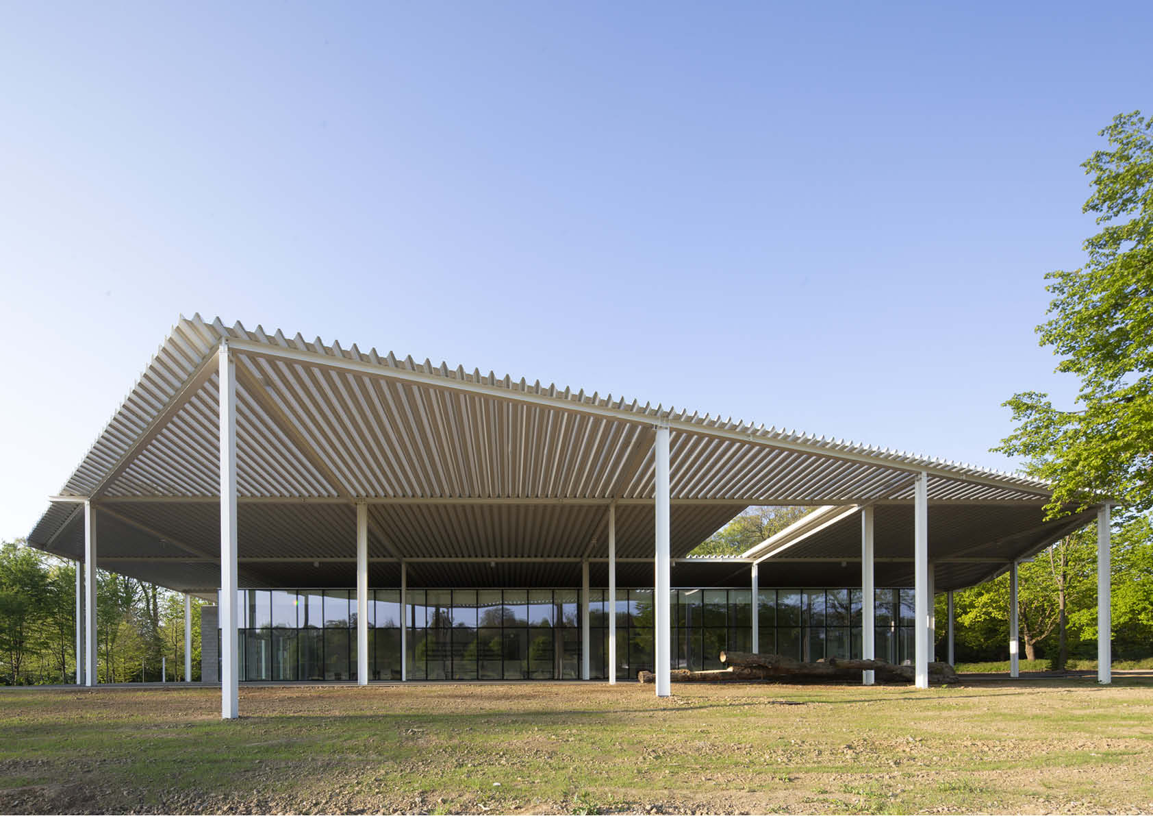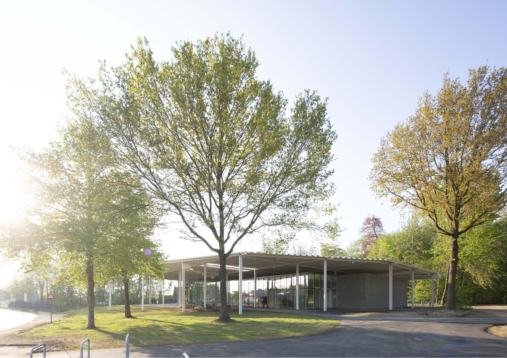 Verre, acier et béton. Ce sont les matériaux dont est composé le nouveau pavillon d’accueil du château de Gaasbeek. Le squelette de la structure se compose de 26 colonnes ancrées dans le sol à l’aide de bases de fondation séparées. Depuis le toit du bâtiment lui-même, 10 autres colonnes assurent la rigidté nécessaire. L’élément le plus impressionnant de la construction consiste en l’énorme auvent de toiture, d’une superficie totale de 1.470 m2. Il est composé de tôles en acier à nervures larges qui évacuent toutes les eaux de pluie et les feuilles mortes par l’intermédiaire d’une large gouttière et d’un entonnoir vers un collecteur en béton.