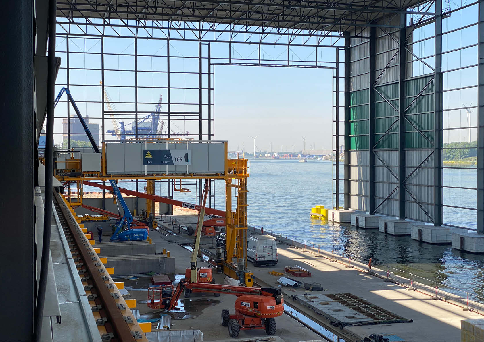 Le quai couvert de 200 mètres de long, avec son dock d’une largeur de 25 mètres et un volume de 30 mètres au-dessus de l’eau, est une caractéristique unique de l’All Weather Terminal. Il permettra aux péniches et aux bateaux de mer d’une capacité de charge maximale de 10 000 tonnes et d’un tirant d’eau maximal de 8,20 m de s’amarrer au nouveau quai, bien à l’abri des intempéries.