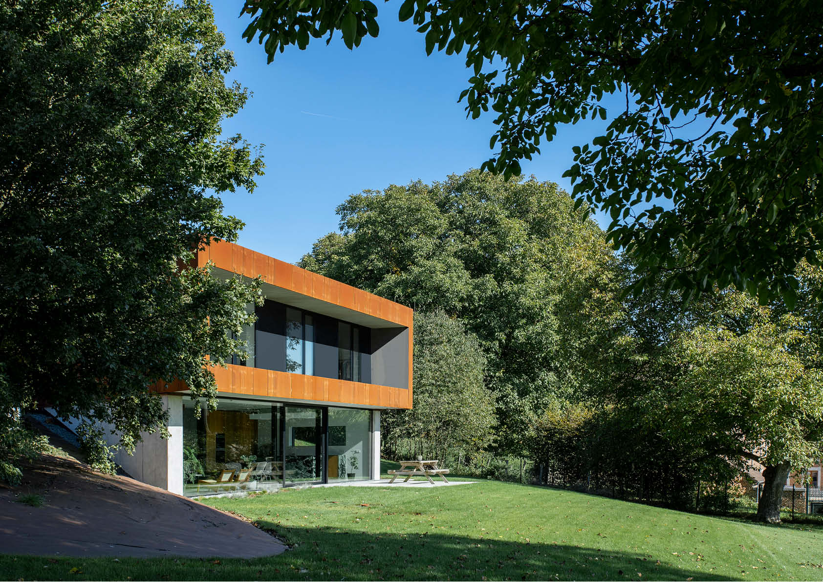 Pour éviter une ambiance trop froide, les maîtres d’ouvrage ont fait installer un bardage en acier Corten sur l’ensemble des façades du niveau 0, pour un total de plus de 138 m². De largeurs différentes, les panneaux apportent également rythme et relief à l’intérieur. Au-delà de son aspect esthétique de la rouille et la patine caractéristiques de l’acier Corten, celui-ci s’avère également être un choix pratique : grâce à ses qualités auto-protectrices, il ne requiert aucun entretien.