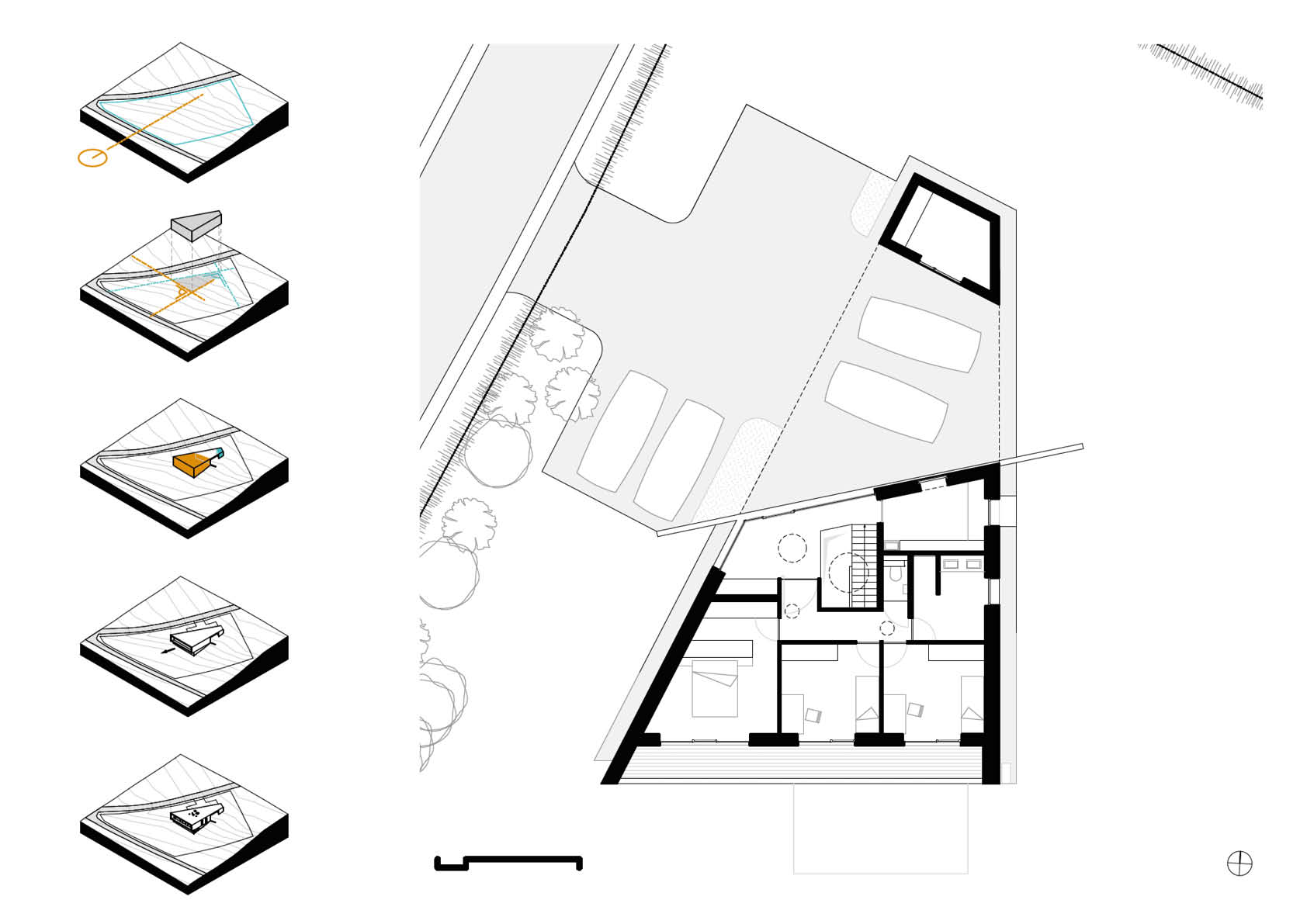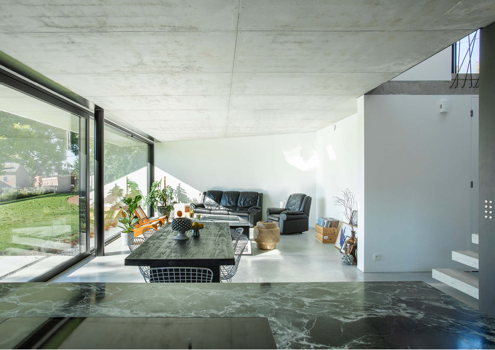Les maîtres d’ouvrage de cette maison, passionnés d’architecture, ont décidé d’allier béton et acier corten, pour des raisons pratiques comme esthétiques. L’élément porteur de la structure est un voile de béton de 6 mètres de haut, coulé sur place et laissé apparent pour un style délibérément brut. Les murs et les plafonds sont conçus en dalles de béton coffrées et la dalle de sol est en béton lissé à l’hélicoptère.
