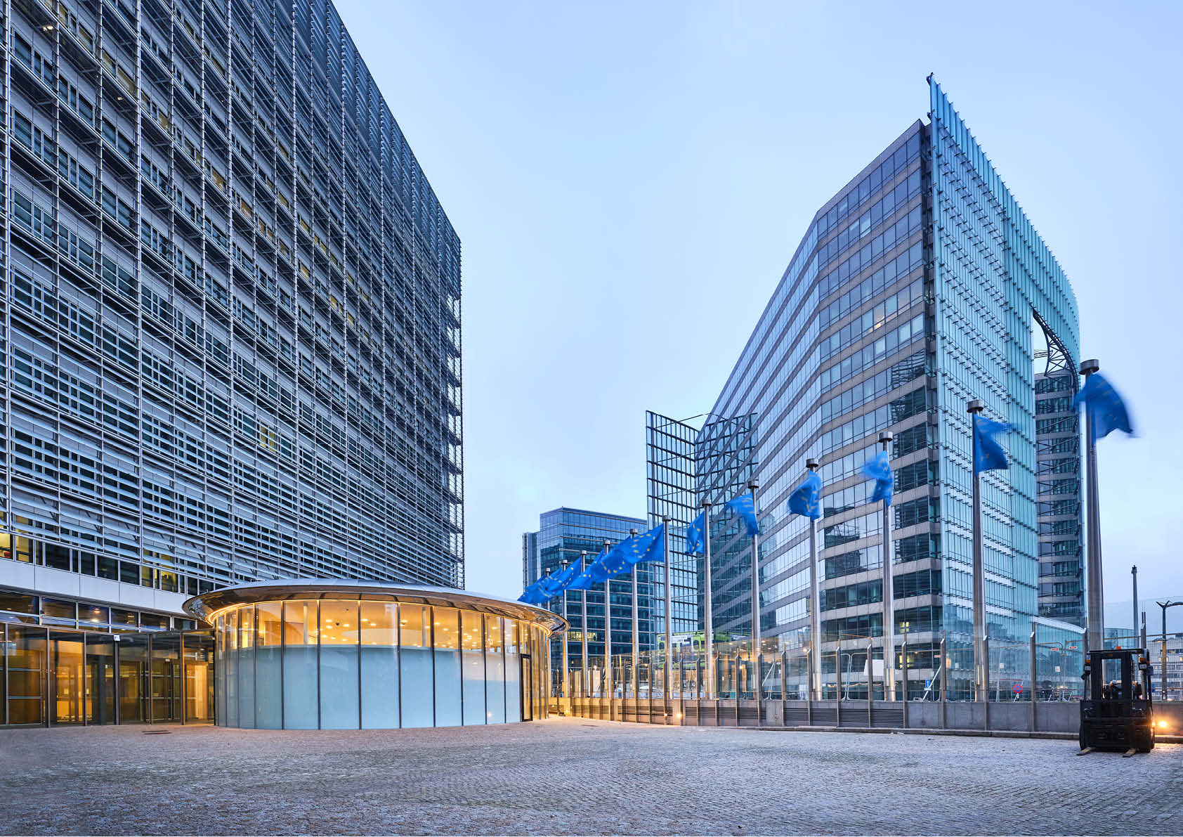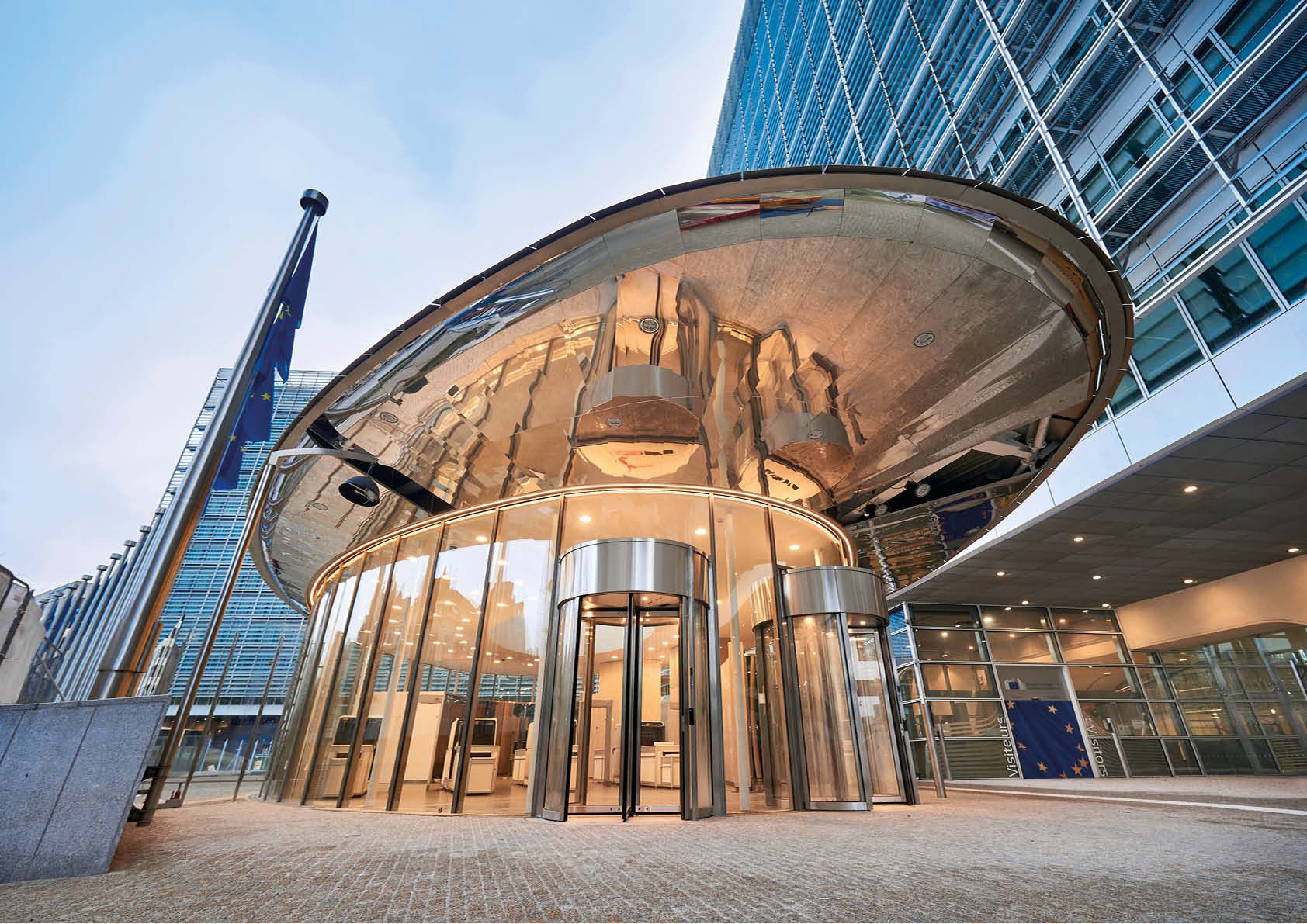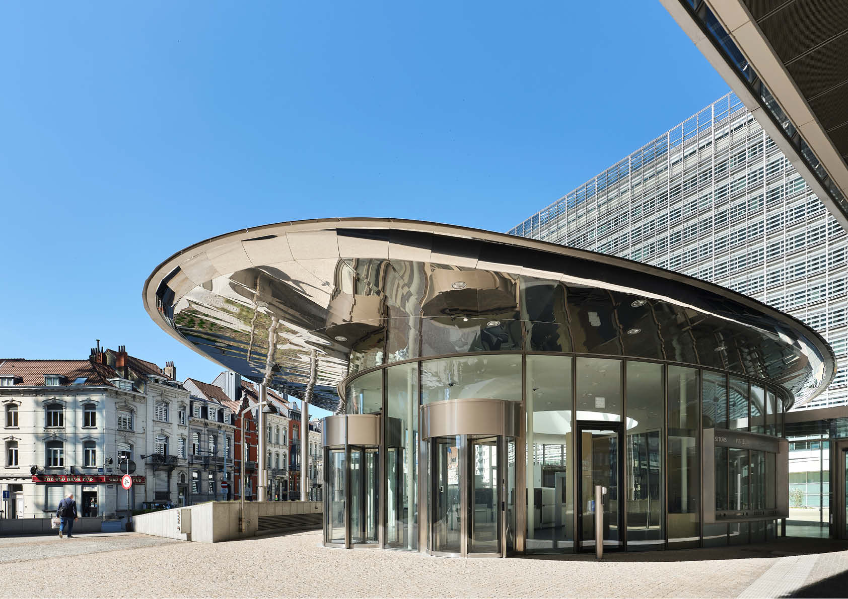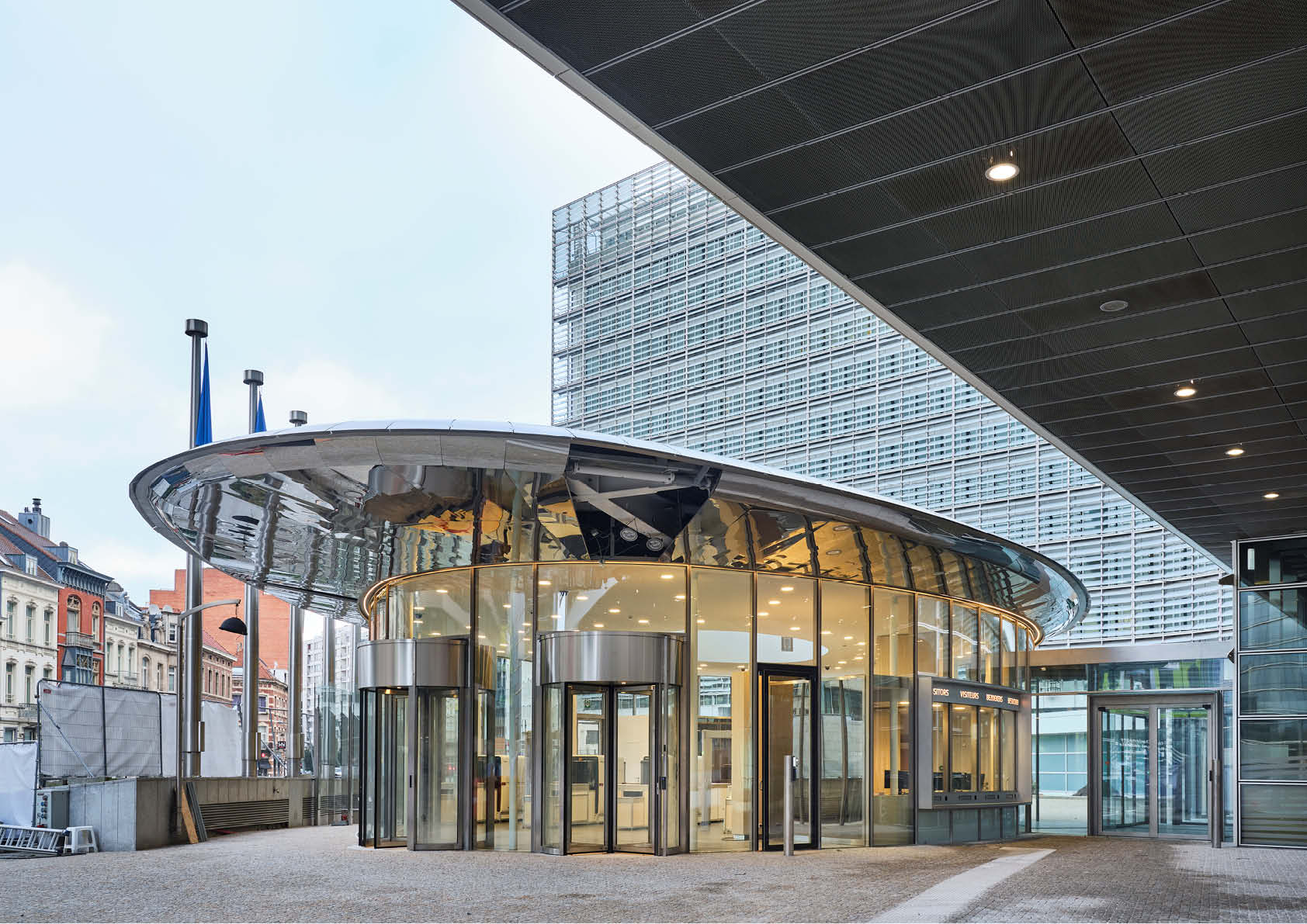 Pour la Commission européenne à Bruxelles, un pavillon elliptique a été construit au pied du Berlaymont, pour accueillir les visiteurs et mieux sécuriser le site.
