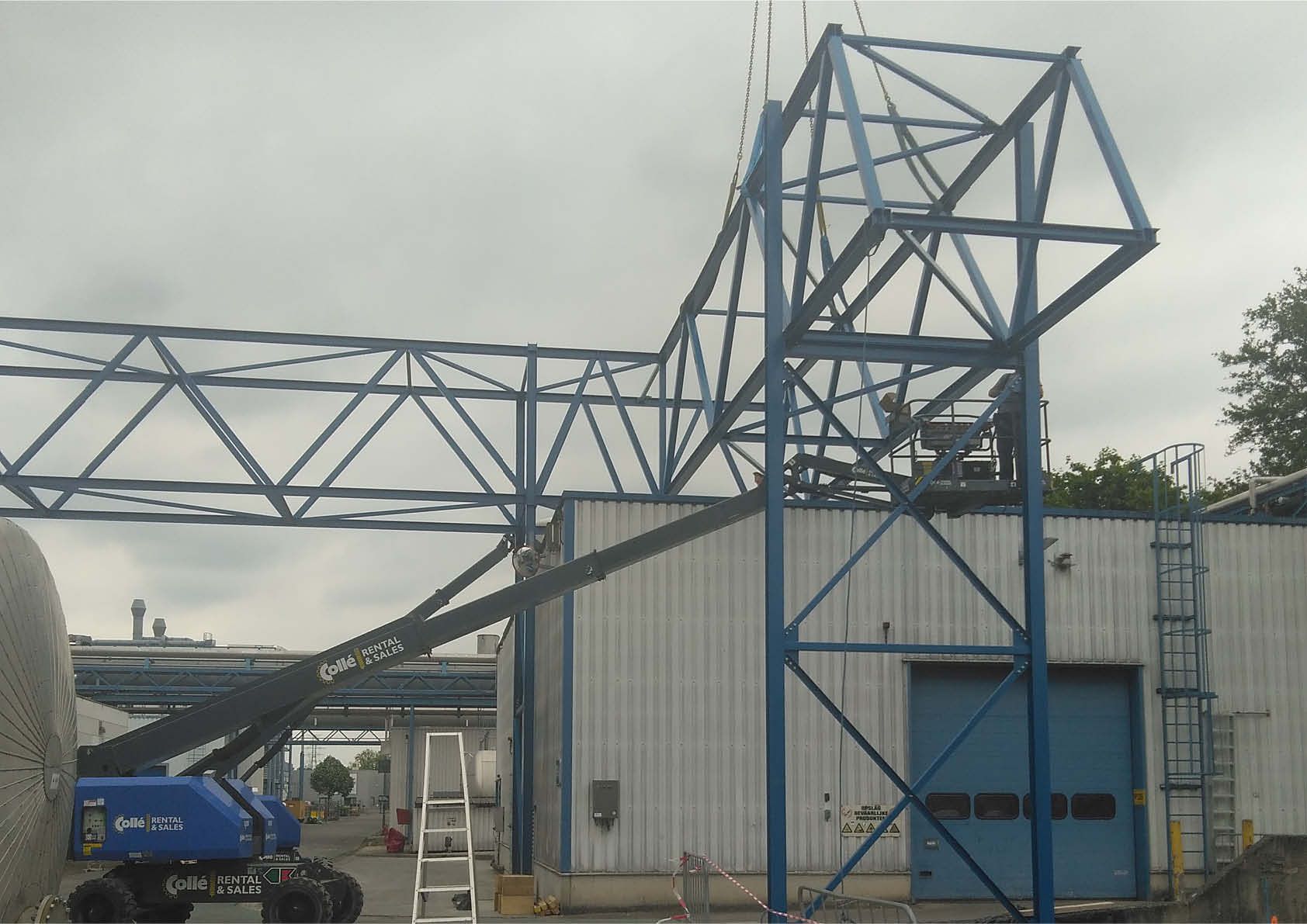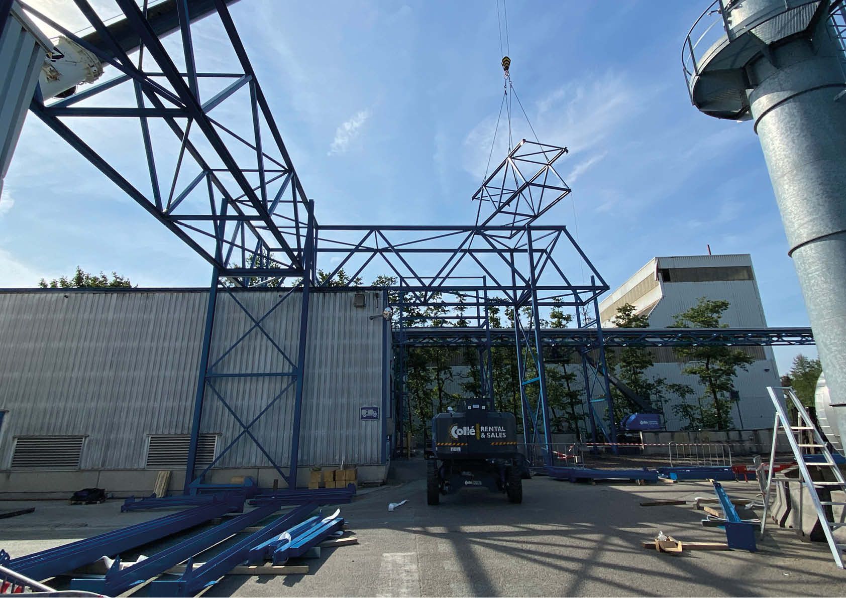 La première section se trouve au-dessus d'un bâtiment sur lequel on trouve un grand nombre de tuyaux, de plateformes, d'escaliers et d'échelles. La deuxième section passe au-dessus d'une passerelle de conduites existante et complètement indépendante de la nouvelle structure. L'exécution finale en treillis comprend 43,5 tonnes d'acier S235JR. L'ensemble a été métallisé et recouvert de deux couches de peinture RAL 5019. Les colonnes et les passerelles ont été préassemblées au sol, puis hissées en place à l'aide d'une grue lourde (140 tonnes).