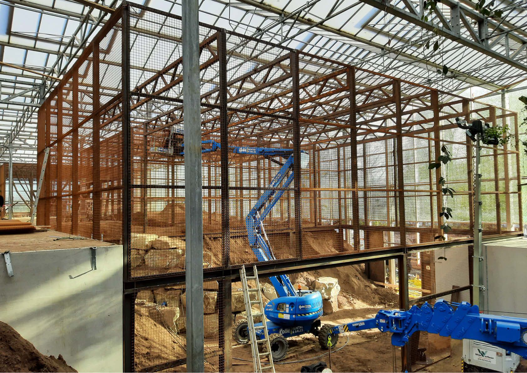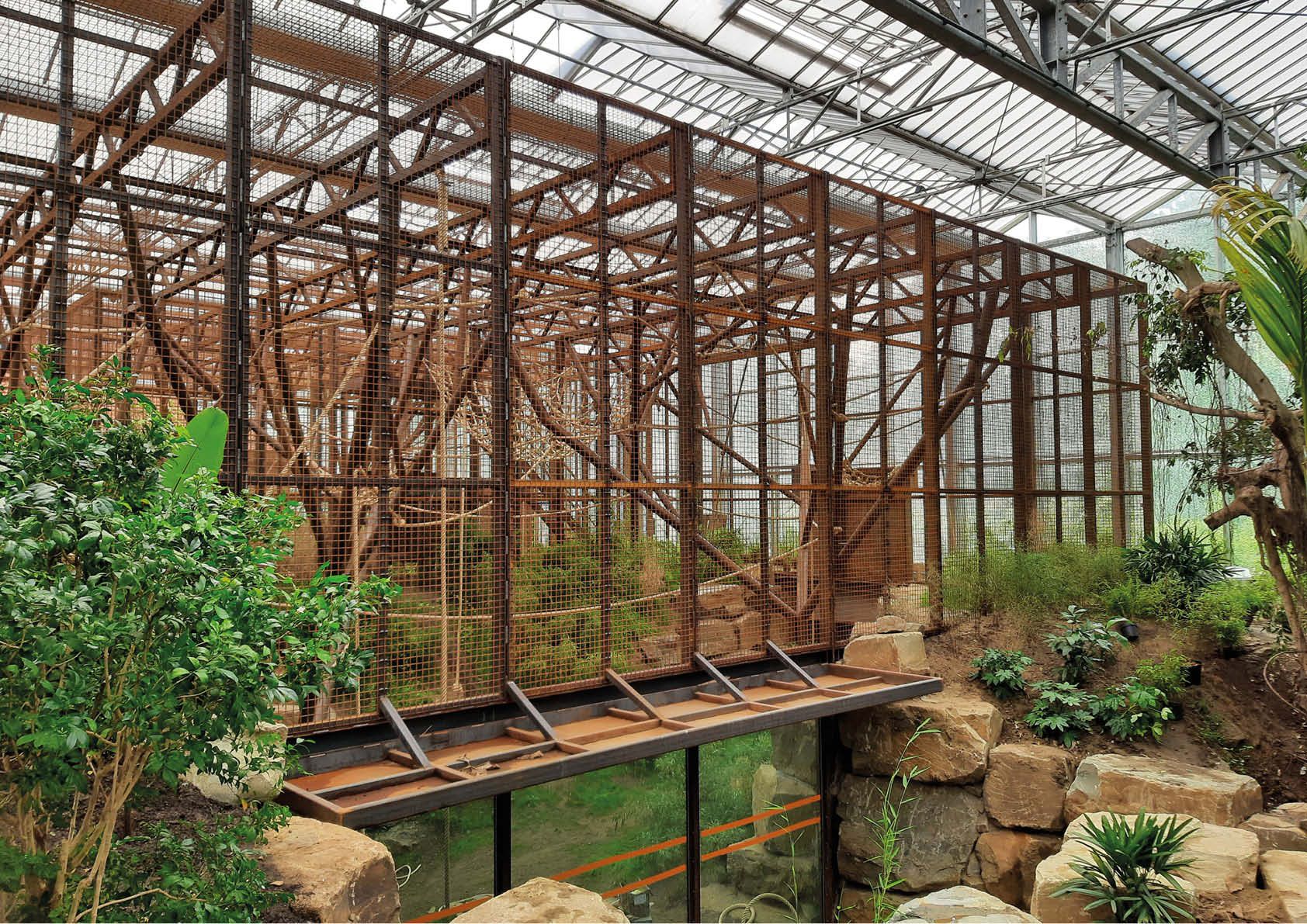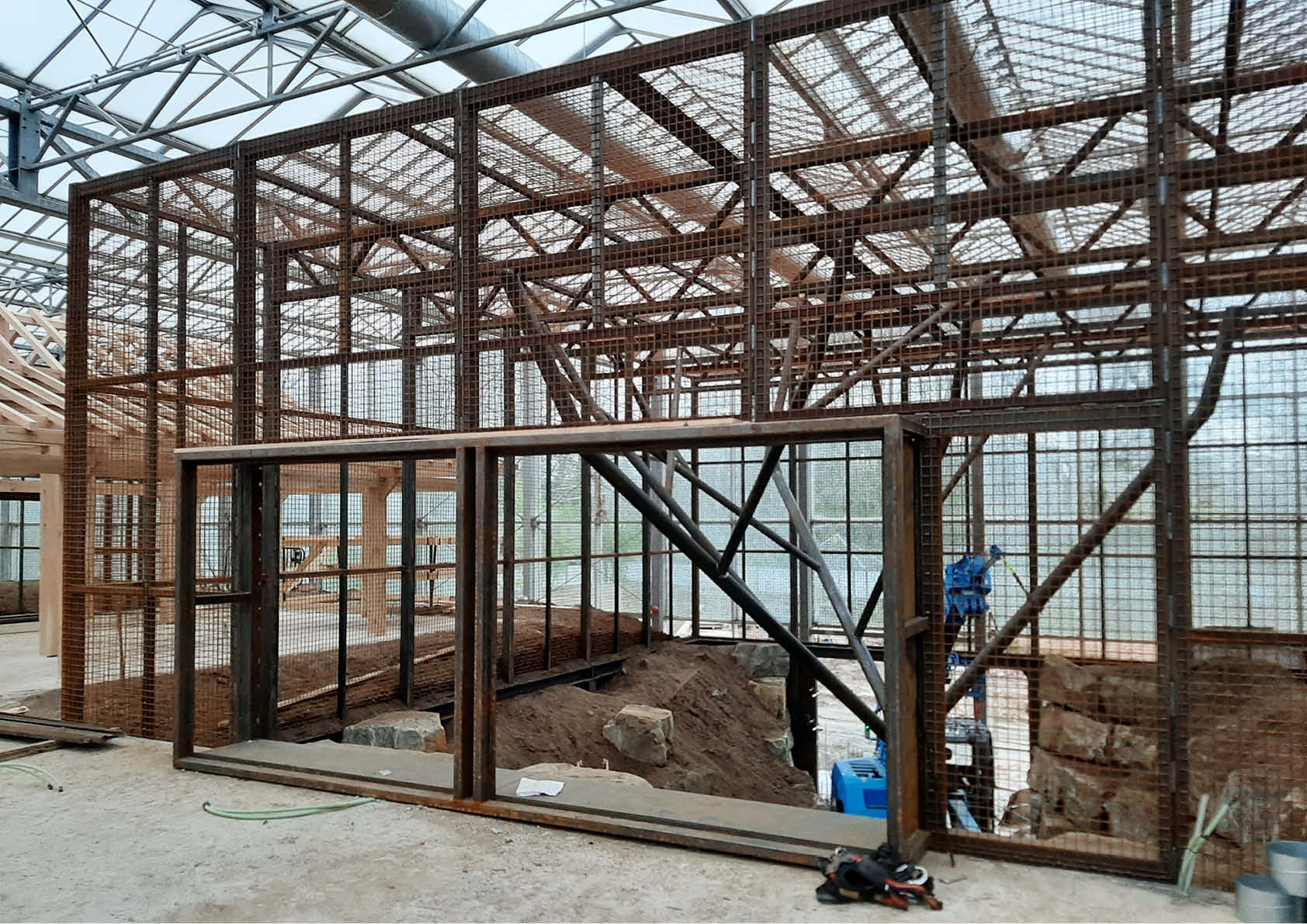 Les orangs-outans étant les singes les plus intelligents et les maîtres de l'évasion, il a fallu utiliser un minimum de joints boulonnés. Dans les endroits où cela s’est révélé inévitable, les écrous ont été soudés pour éviter qu'ils ne puissent être dévissés. Les arbres en métal, qui ont été entièrement dessinés en 3D, ont une circonférence et une hauteur d'environ 8 mètres. Les portails automatisés sont équipés d'un vantail métallique de 600 kg.