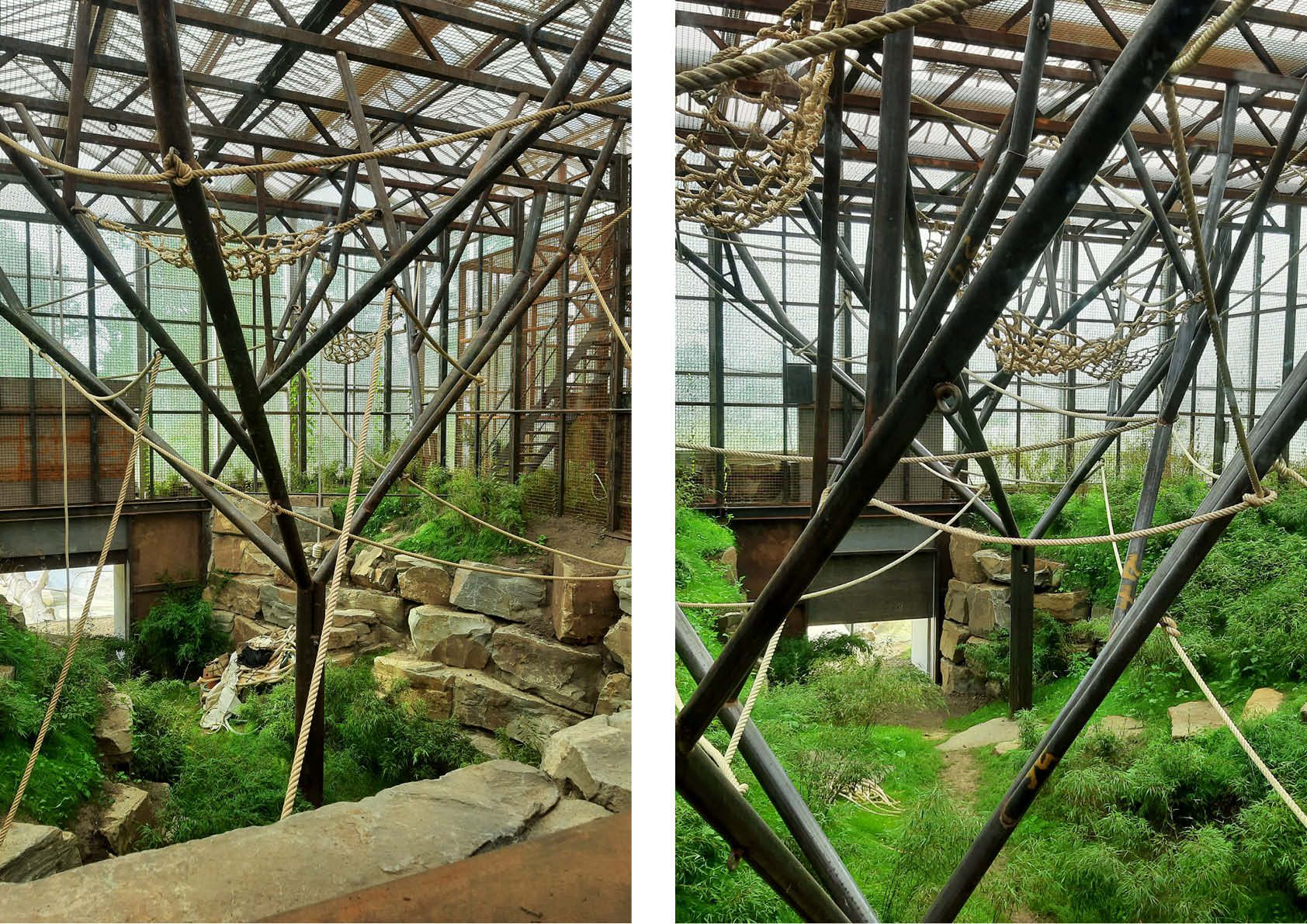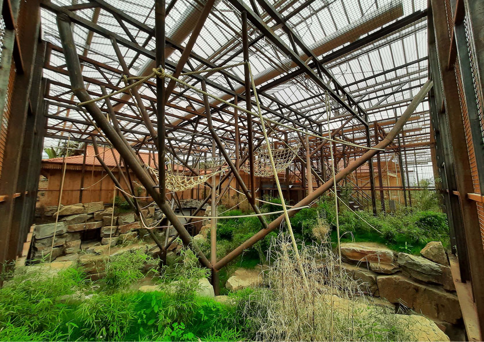 Il a été construit dans une serre existante de 100 x 100 mètres et 9 mètres de haut. Un soubassement métallique sert de base à des cadres de 2 mètres de large et 5 mètres de haut avec des filets en acier, pour un poids total de 11 tonnes. La poutre du toit est un treillis, composé de tubes de 100x100x5 et de 60x60x3 : assez solide pour une portée de 12 mètres et un grand singe de 150 kilos qui se balance.