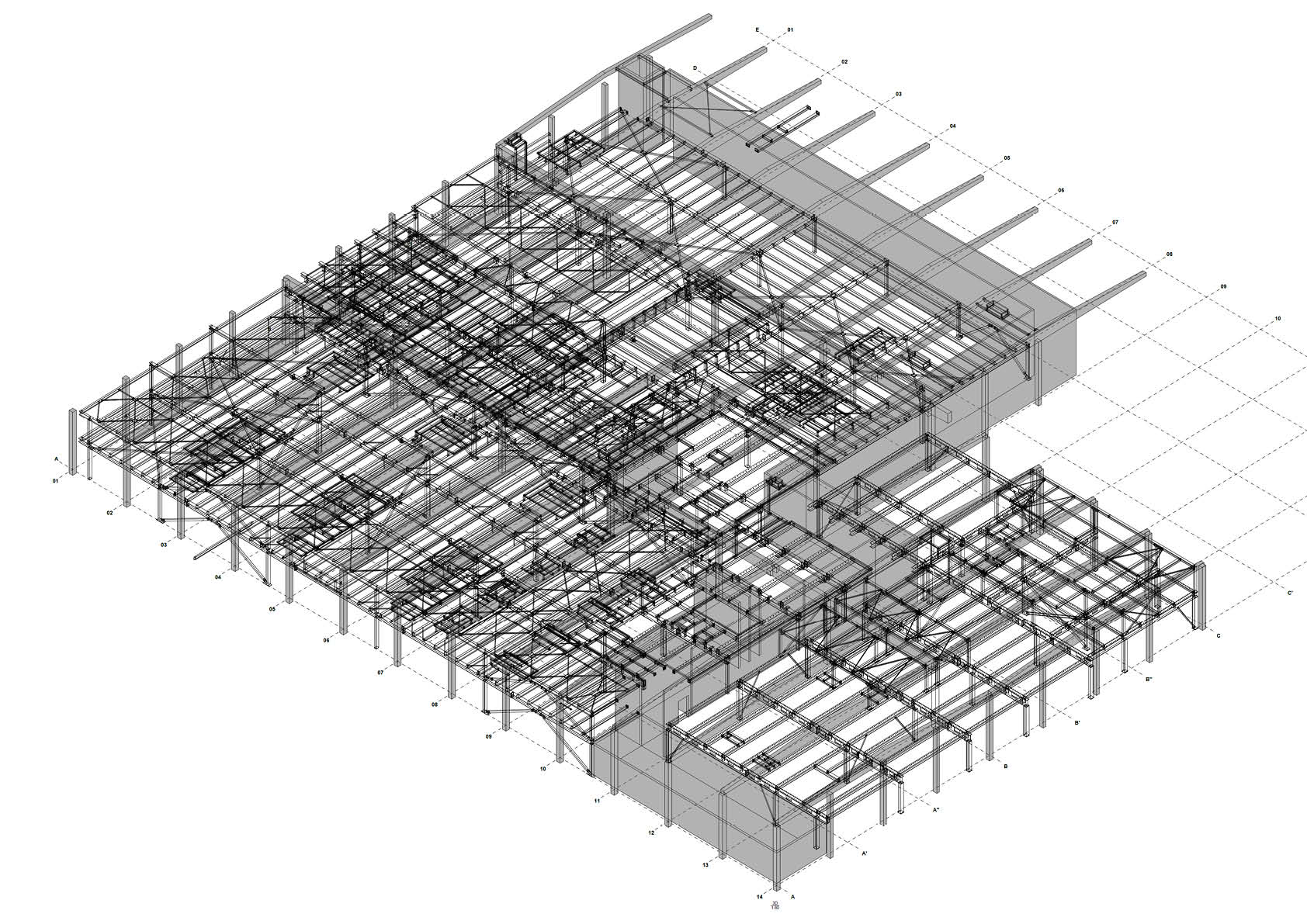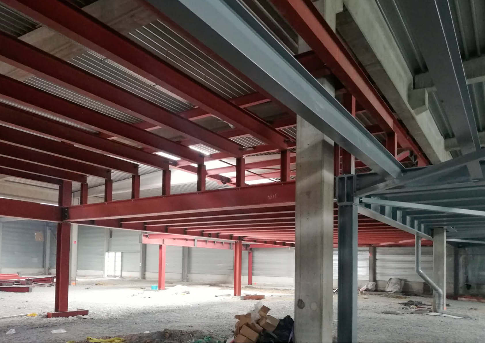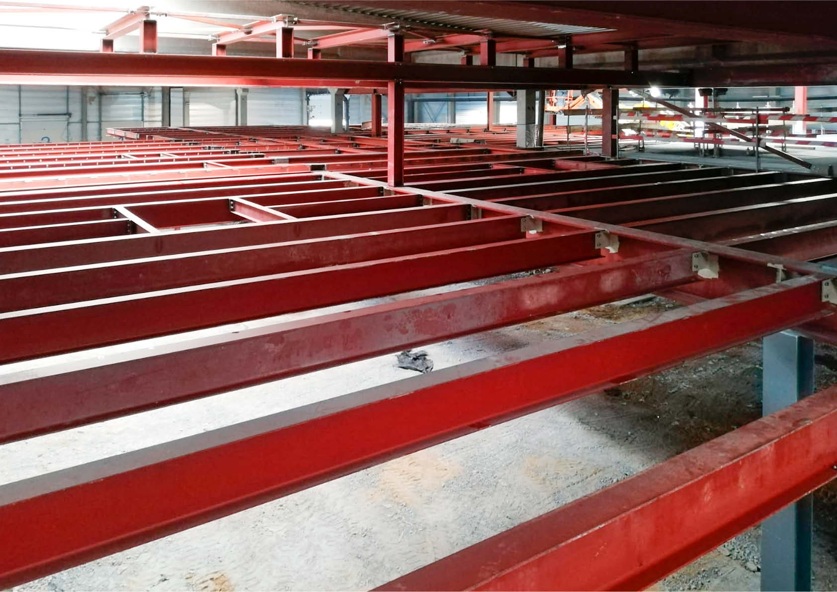Dans un entrepôt acheté par MaSTherCell/Catalent, une entreprise pharmaceutique active dans la thérapie cellulaire et génique, un étage technique complet a été intégré à une hauteur de 3,2 mètres - en partie un plancher à grille, en partie un plancher en béton (tôle d'acier à queue d'aronde + remplissage en béton). Cela a aussi nécessité une structure de suspension juste en dessous des poutres en béton existantes (environ 6 mètres de hauteur libre).