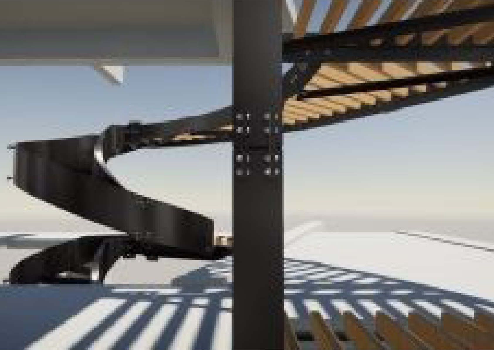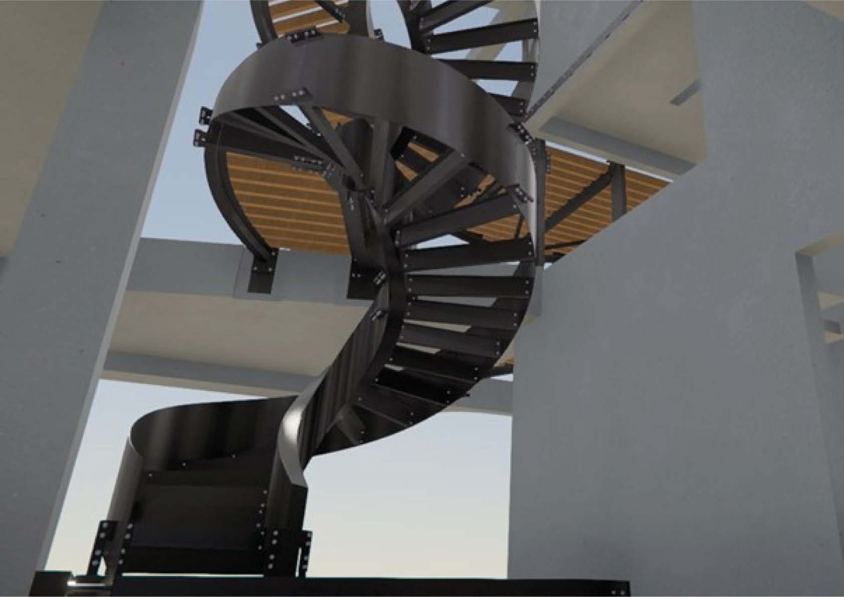 Le nouvel escalier en colimaçon dessert plusieurs niveaux d'un penthouse dans un bâtiment existant. La construction comprend l'escalier elliptique en colimaçon avec des plaques torsadées ainsi que les différents niveaux du penthouse.