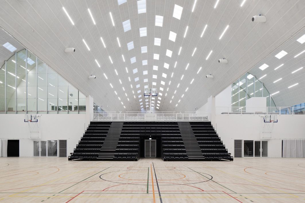 La nouvelle construction comporte une salle de sport double d’une superficie de 4800 m² avec, au centre, les espaces de services et les tribunes. La structure de la toiture est constituée de trois voûtes en plein cintre, perpendiculaires à cette distribution. La structure particulière de la toiture confère au niveau bâtiment une identité propre qui dialogue avec la toiture voile mince de la piscine existante. La section transversale de la structure de la toiture est constituée d’une série de 3 axes à triple articulation construits à partir de profils HEB300 cintrés sur mesure.