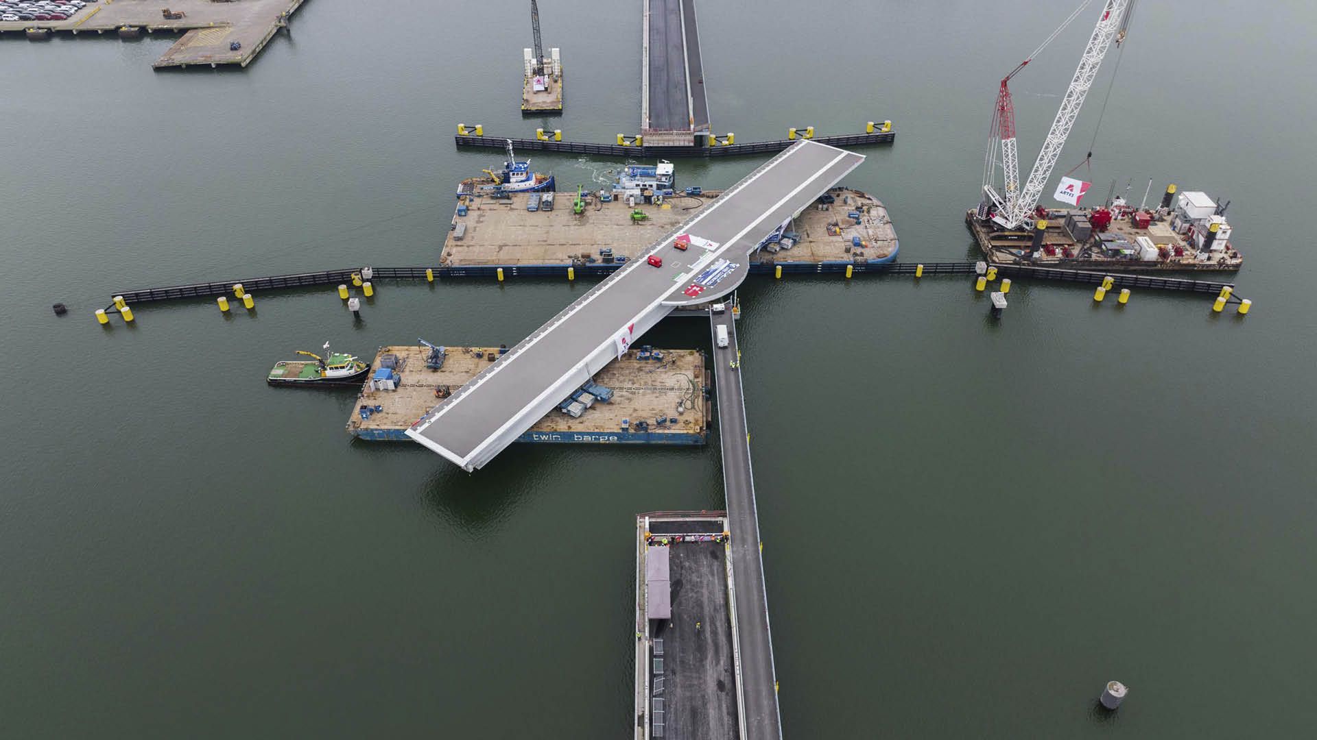 Un nouveau pont mobile dans le 'Verbindingsdok' (bassin de raccordement) à Zeebruges offre une meilleure connexion pour le trafic portuaire et assure d'autre part, un accès sûr au port intérieur pour les cyclistes.