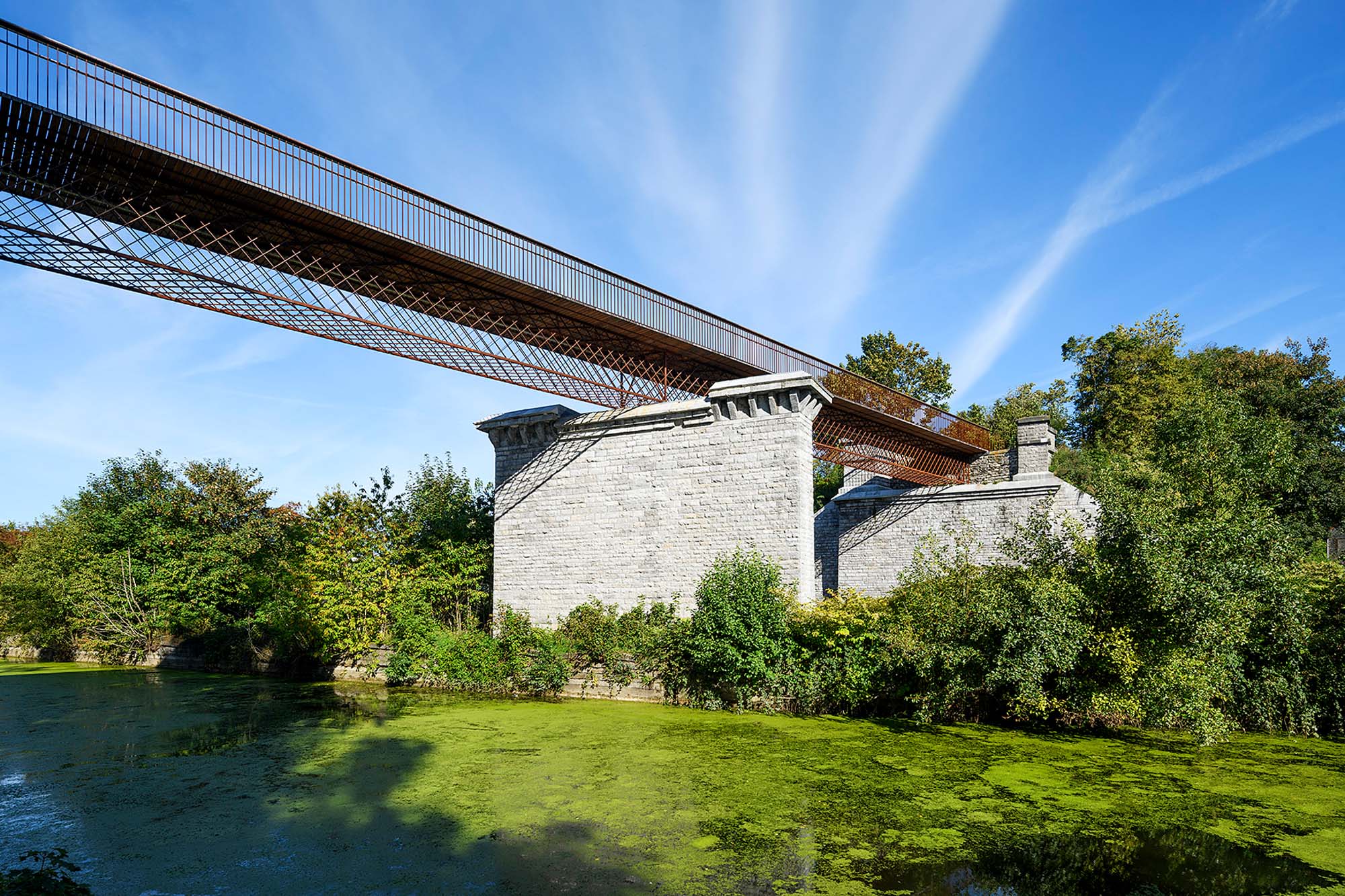 Il s’agit d’une passerelle en acier auto-patinable de 54 m de longueur composée de deux travées. Cette passerelle est installée sur des anciennes culées et pile d’un pont ferroviaire démonté après la Seconde Guerre mondiale.