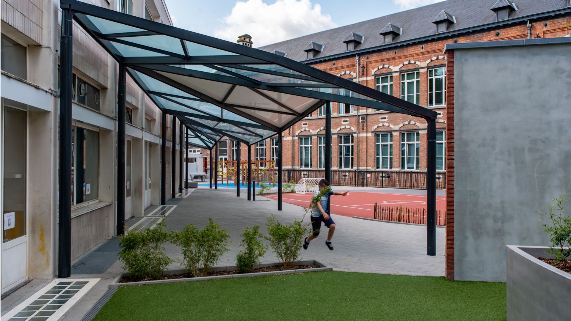 Sept préaux en acier avec couverture en verre collé
