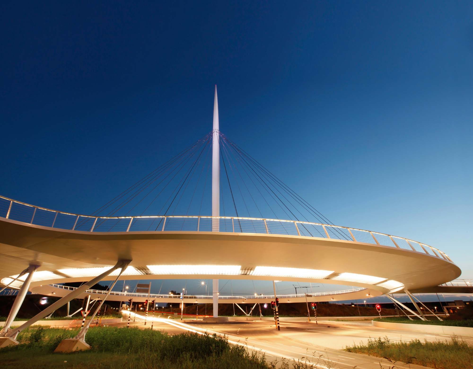 Pour garder une pente confortable pour les cyclistes, le rond-point a été aménagé en profondeur. Ainsi, la différence de niveau pour les cyclistes a pu être réduite à 1,5 m. Le tablier flottant est fixé par dessus au pylône grâce à 24 haubans en acier, tandis qu’il est soutenu en dessous par des points d’appui en forme de M. Ces derniers sont constitués de deux barres de compression en forme de cigare qui, ensemble, forment un V, complétées sur les côtés par deux tirants. L’ensemble donne un point d’appui en forme de M. En outre, le tablier a une construction en boîte dans laquelle des nervures sont soudées sur 332mm d’axe en axe aussi bien sur la plaque inférieure que sur la plaque supérieure. On obtient ainsi une finesse maximale.