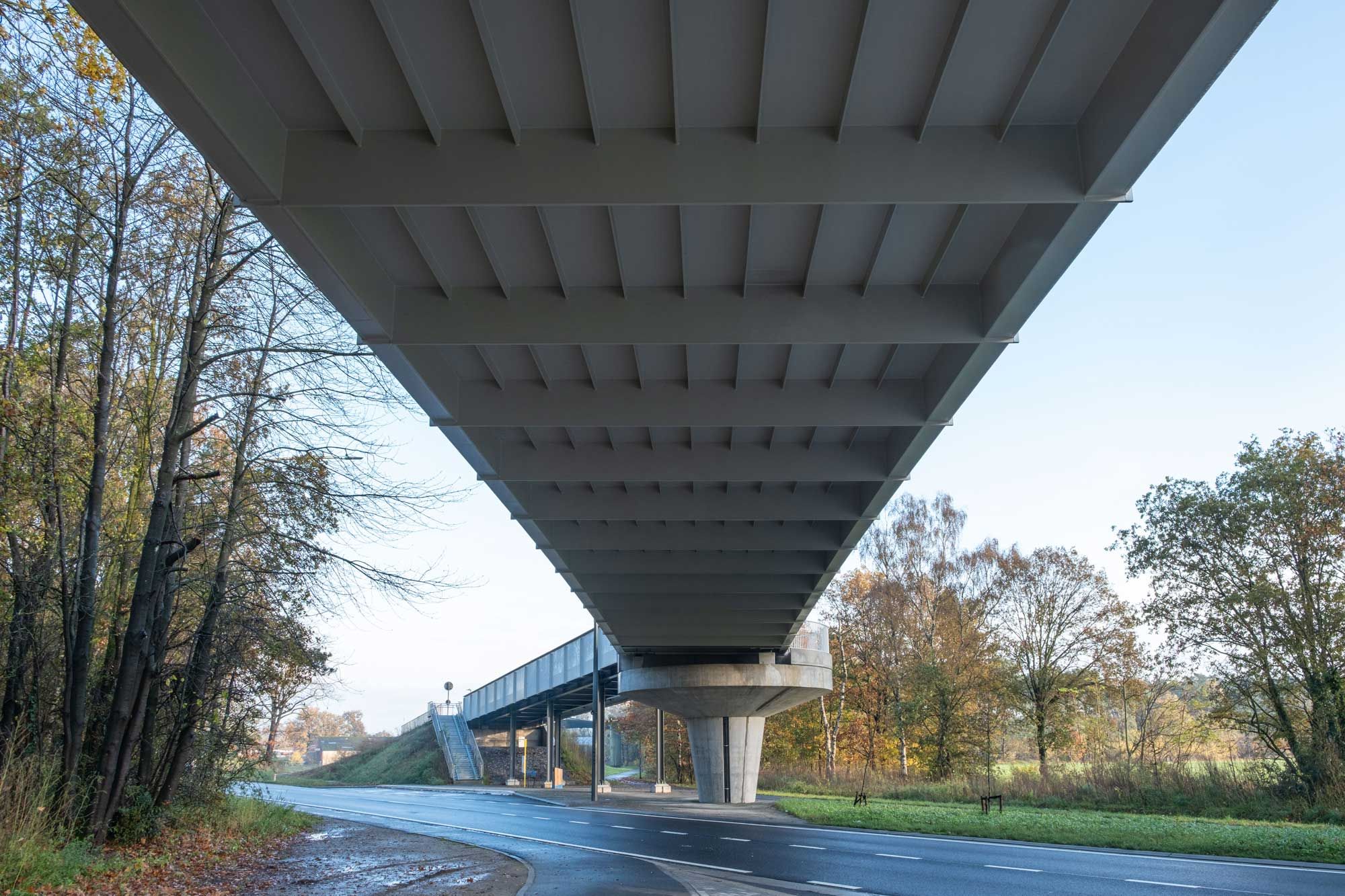Le pont cyclable de Helchteren au Limbourg belge, ouvert en 2023, constitue une liaison sûre et durable entre le quartier Kievitwijk et la zone PME, au-dessus de la N715. Intégré à la véloroute F74, il offre un passage confortable aux cyclistes et aux piétons. La conception du pont est aussi fonctionnelle qu'intégrée dans le paysage. Sur le côté ouest, une rampe légèrement inclinée guide les cyclistes et les piétons entre les cimes des chênes pédonculés matures. Cette intégration naturelle offre une expérience agréable de la végétation environnante. Au sommet du pont se trouve un espace de repos doté de sièges, où les usagers peuvent faire une pause et profiter de la vue sur la réserve naturelle de Molenheide. À l'est, le pont est relié à une structure métallique robuste qui s'intègre visuellement dans le contexte industriel de la zone PME. Ce virage offre également un endroit pour s'arrêter un instant et admirer le paysage. Le pont a été conçu dans un souci de multimodalité. Il est relié à des arrêts de bus rénovés, à des passages piétons sécurisés et à un réseau de pistes cyclables et de sentiers pédestres réaménagé. Il en résulte un nœud où se rejoignent différents modes de transport, contribuant ainsi à la transition vers des déplacements durables. Le pont est en outre entièrement accessible aux personnes à mobilité réduite, grâce à sa pente progressive et à ses chemins larges et dégagés.