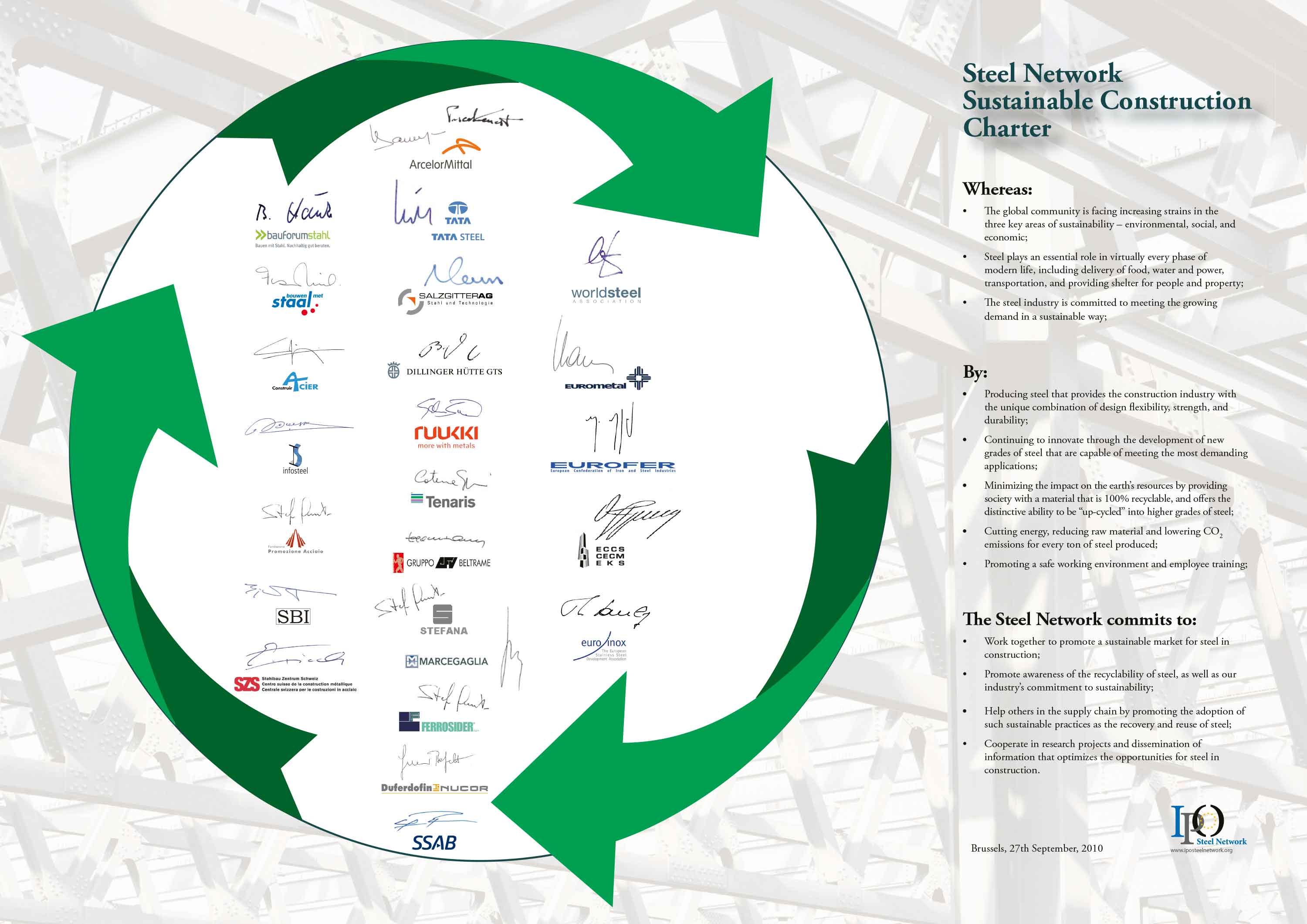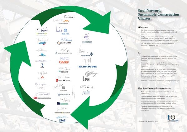 At the invitation of IPO Steel Network, the European network of steel promoting organisations, representatives of the European and global steel sector met on Monday 27 September 2010 in Brussels for the signing ceremony of the Steel Network Sustainable Construction Charter.