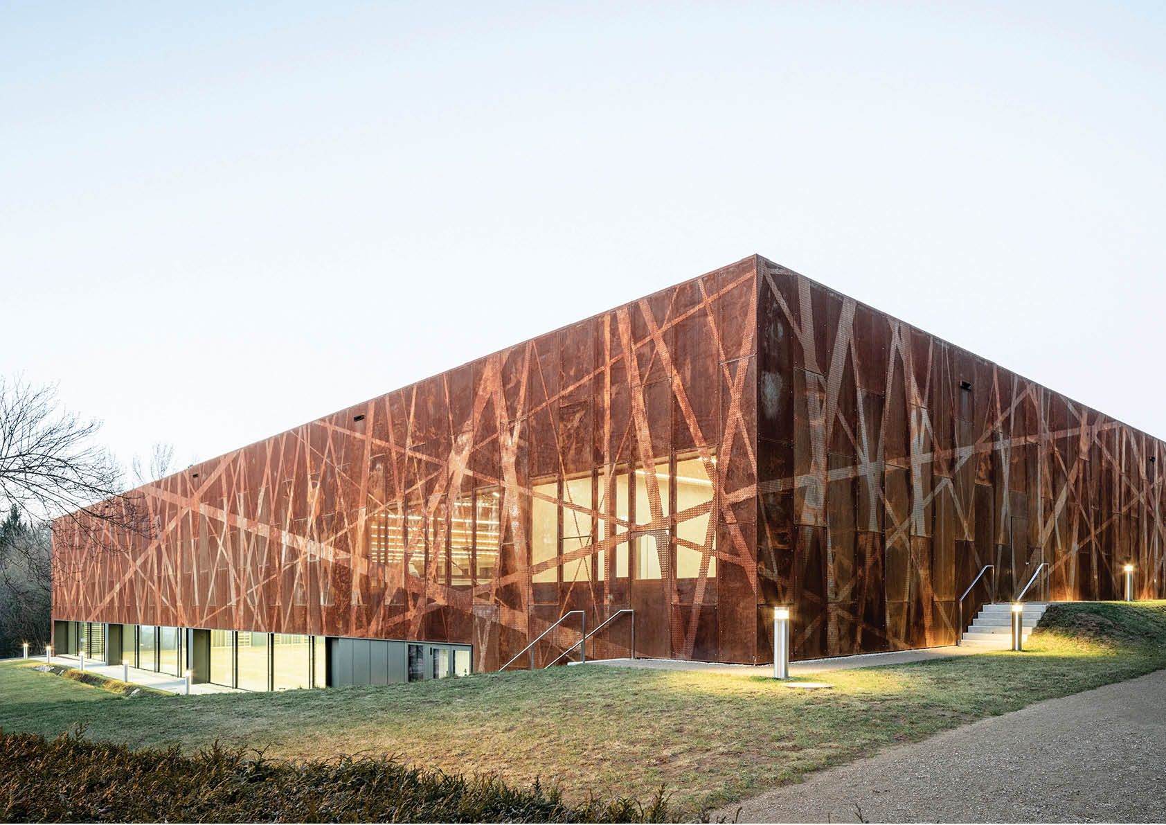Deze 3000 m2 grote sporthal is bekleed met een gevel in geperforeerde weervast staalpanelen (corten). Aangezien hij geïnspireerd is op de natuur en de omliggende bossen, creëert de cortenstaalgevel de beoogde ruwe, natuurlijke uitstraling. Andere troeven zijn het economische aspect en de lange levensduur. De perforaties genereren een beeld van kriskras door elkaar lopende stroken met verschillende breedtes. Elk geperforeerd metaalpaneel is uniek om de continuïteit van de patronen te garanderen. Ze zijn ook doorgetrokken naar het interieur. Vanaf de inkompartij heb je een royaal uitzicht op de zitjes van de toeschouwers en het sportveld beneden. Achter de tribunes blijven de perforaties zichtbaar. Dit draagt bij tot de creatie van een unieke lichtbeleving en filtert de zichtlijnen naar de straat. De openingen in de gebouwschil, die ongewoon groot zijn voor een sporthal, zijn strategisch gepositioneerd om de band met de omgeving te versterken.