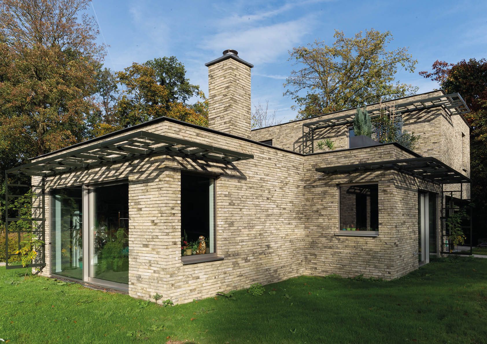 Dankzij haar vorm, het uitgekiende materiaalgebruik en de specifieke kleurkeuze is deze eengezinswoning met architectenbureau perfect ingebed in de groene omgeving. Het idee was om oververhitting via de zuid- en westgerichte glaspartijen te vermijden door middel van schaduwrijke en verkoelende klimplanten op drie stalen luifels. Deze laatste zijn telkens opgebouwd uit drie vlakken, ingedeeld in segmenten met een wederkerend patroon en opgehangen tussen stalen vinnen die aan de ruwbouw bevestigd zijn.